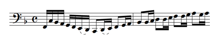 Whereas we have said, in the previous chapter, to avoid slurring in diminution repertoire, in repertoire written for the dulcian in the seventeenth century the situation changes. First of all, we see that the sixteenth note is no longer the smallest note value, thus demanding a different approach to articulation. And secondly, in the rapid passages of sixteenth notes in the lowest range of the dulcian, slurs come in handy since these notes are sometimes hard to attack with a double-tongue.
