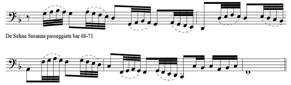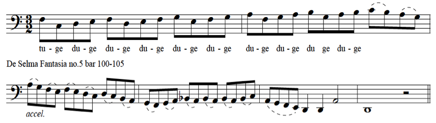 These two examples are compositions based on the same madrigal Susanne un Jour by Orlano di Lasso (c1532-1594), but composed fifty years apart. In the second example De Selma uses the same kind of diminution patterns as Dalla Casa had used in 1584. Although in other places in the same piece, De Selma uses material that does not resemble vocal diminutions at all.