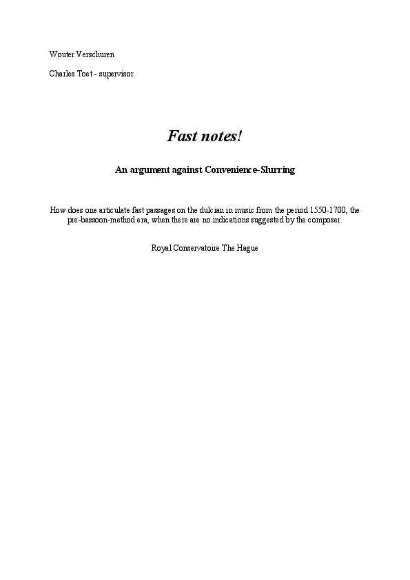 The purpose of this research is to investigate the different ways of articulating fast passagework on the dulcian in repertoire spanning the period ca.1550 until ca.1700. Prior to 1787, when Etienne Ozi published his first edition of the Nouvelle Methode de Basson, there are no sources known that specifically discuss articulation or (double) tonguing on bass double reed instruments. When we perform music from this era, we are in the dark as how to articulate highly virtuosic passages. What is preferable: Two-by-two slurring? Slurs over more notes, or maybe the use of some kind of double tongue-stroke? During this research I will focus on primary sources that deal with articulation on various non-reed wind instruments of the period in question, such as the recorder, the cornetto and the trumpet. By studying the indications and recommendations given by masters of the past we can deduce their musical intensions. When we accept these authors as our guides, they may be able to help us imagining what articulation on a double-reed instrument could sound like. The moment we envision this concept, we can start to translate their instructions into articulation on reed instruments. The output is threefold: 1. A paper describing the different ways on how to articulate fast passagework on the dulcian and on the bassoon in a way that matches the souplesse and speed of non-reed instruments. 2. Two compositions written for the dulcian, with added articulation-markings by the author. 3. Video examples clarifying some musical examples. With this project I hope to shed light on practical issues of the performance of highly virtuosic repertoire for dulcian and bassoon from the sixteenth and seventeenth century.