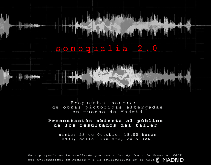 Sonoqualia 2.0 has as its main objective the creation of musical experiences related to pictorial works housed in museums of Madrid. It is aimed at people with visual disabilities, but the methodology can be in subsequent phases, applied to be experienced by people without disabilities, considered as an expanded and independent aesthetic experience. The project, is conceived as a 5-week workshop in which the participants work in groups, assisted by technicians who facilitate them the access to sound-composition software. The result is the creation of sound pieces with a duration around 2 minutes made by the participants.