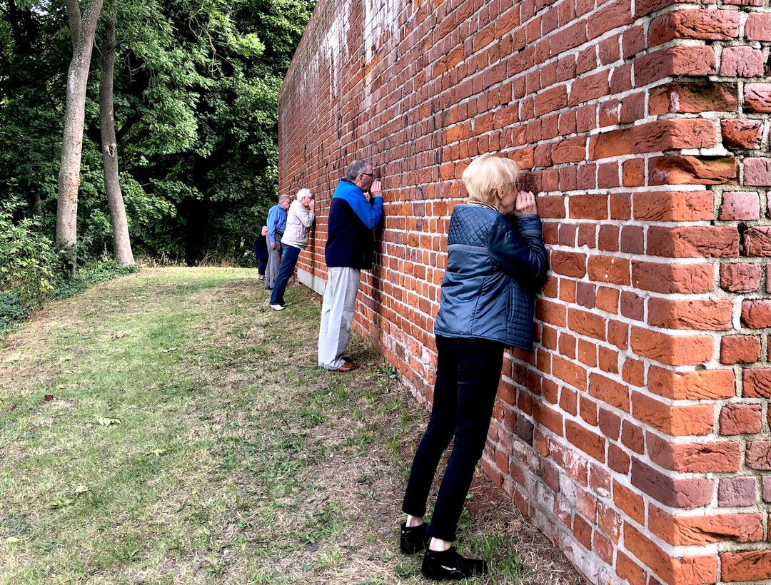 At the back of the mansion the singers formed a circle. In spatially arranged groups they sang different parts of the local saga Schatz Haus Demmin (Eichblatt, 1925), varying in tone, allowing harmonies and disharmonies to appear and fade.