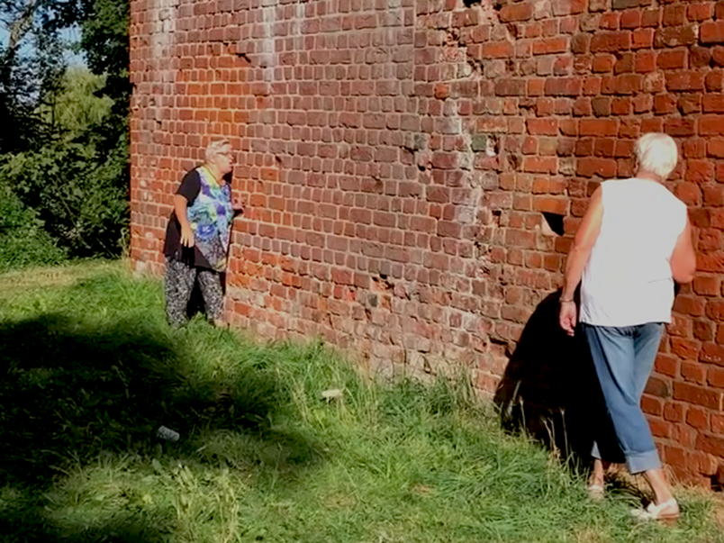 At the ruin two women were leaning with one shoulder on the same wall, standing 5 meters apart, facing each other. While looking at each other they alternately sang, close to the wall: "Dat hus - is din - und min - Dem - min".