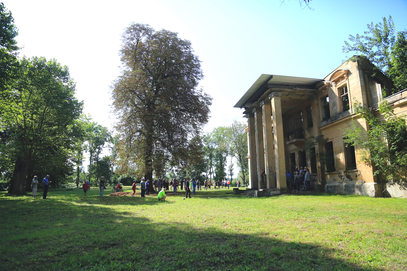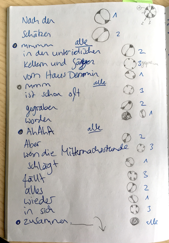 The sound of leaves in the wind was a steady companion during our workshop in the open air. We walked around the mansion, shared memories and collected knowledge of the former boarding school's structure. Some of the singers shared anecdotes from daily life back then. A big empty area next to the house was described as having been filled with trees at one time. With this knowledge the sound of the trees around us seemed to me like presence that made an absence audible, like a network with an evident gap. When I later made notes on this in German, the word Blätter reminded me of the sound that leaves make in the wind. In order to increase the airy/open/breathy "ä" and the clicking of the "ätt", I arranged three groups per tree. The first group would whisper "Blätt", the second group "ätt" and the third "ter", each with a minimal delay between them and the previous group. Now, I would describe the sound more as the memory of what leaves sound like.