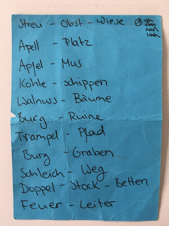 On one of the first days at Haus Demmin I asked the members of the choir to think of words that they associated with the place. The majority of the words turned out to be compounds - words that are joined to make one longer word. These word compositions lead me to create the 'Sound Passage' as an experiment during the workshop. The similar temporal distance between the two words of a compound and the beginning/end of another compound let new connections arise, new associations and word creations. Sometimes meaning only occurred when the second word was audible. Later during the workshop we used the tool of sending words as a chain to each other in order to make communication easier on a site this large. This way the group understood the tool well, and became quite creative with it. One form of the Sound Passage became a part of the sharing. It had fixed words but the singers had space for their own creativity within the frame given to them. In one performance the man first in line for the Sound Passage sent encoded messages to the town mayor - as a surprise to me and his colleagues who willingly passed it on. I do not know if the message was eventually received / understood by the mayor.