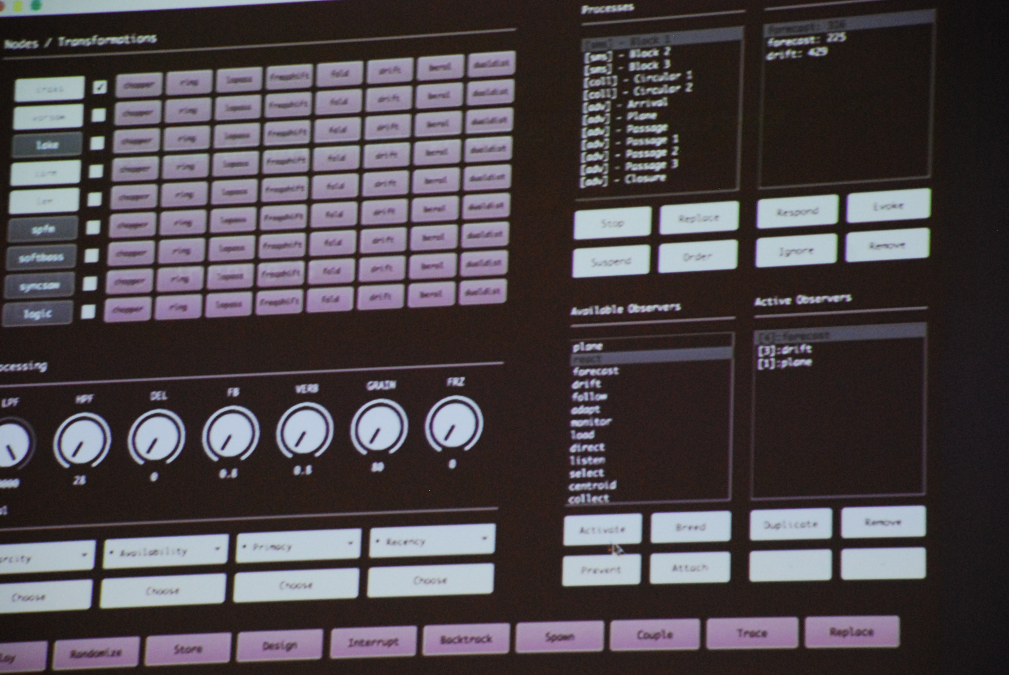 The context of generative processes encapsulates relevant data that influence the behavior of an algorithm including mental domains and ‘internal’ dimensions of a particular context such as goals and decision making. Of creative importance is how an algorithmic process reacts to the influence of its environment, the enclosing conditions from which it emerges. Given a clearly defined set of resources, a variety of processes can operate within the boundaries imposed by a certain context. Such a shared space can be seen as a composable structure, a space where both composition and generative activity take place. Contributing to the evolving properties of a certain situation, the persistence of state means that an environment behaves according to the previous activity that has occurred within it. Opposed to an amnesic situation, a persistent environment can resume previous developments, adapt to long-term interactions and evolve over time. Based on persistence and gradual change, the temporal unfolding of generative processes has an important impact on the becoming of compositional algorithms and the sound material they create.