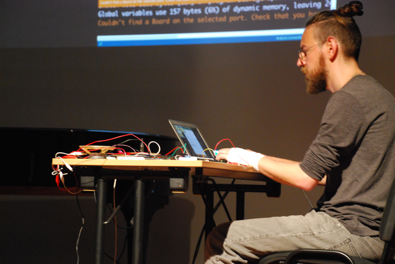 Besides receiving both of the sound sources, SuperCollider will also be in charge of generating the performing directives for the piece, by printing actions that the performer should follow. Those actions can be as strict as “add two resistors to the circuit”, or as broad as “make it groovy...”. Those actions will be pre-written beforehand, and selected at random at a faster and faster pace as the performance evolves, up to a point where it is physically impossible for the performer to follow all the instructions. That impossibility is to be shown via the circuit and/or code manipulation. The process unveiled to the audience, ultimately, is the process of failing.