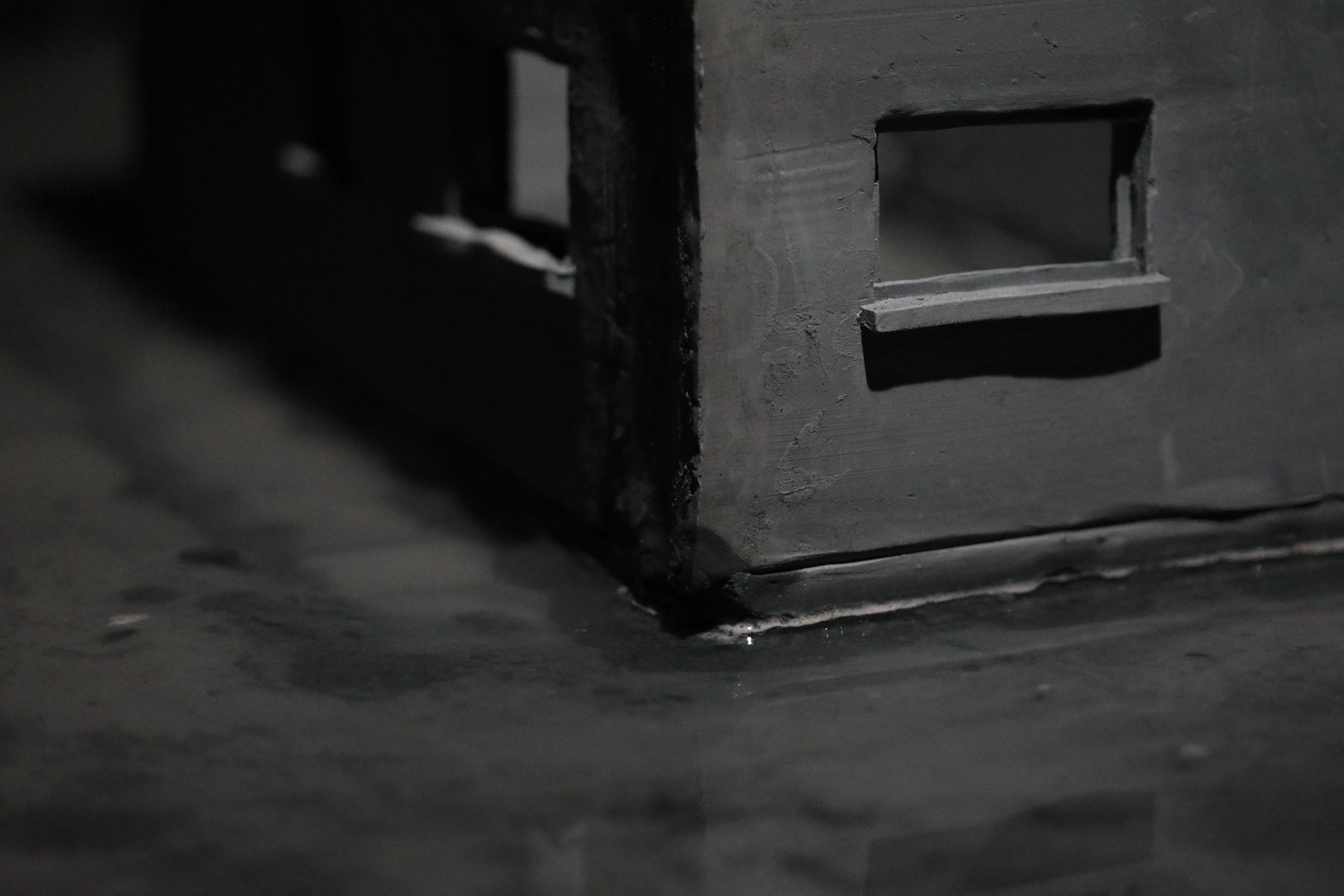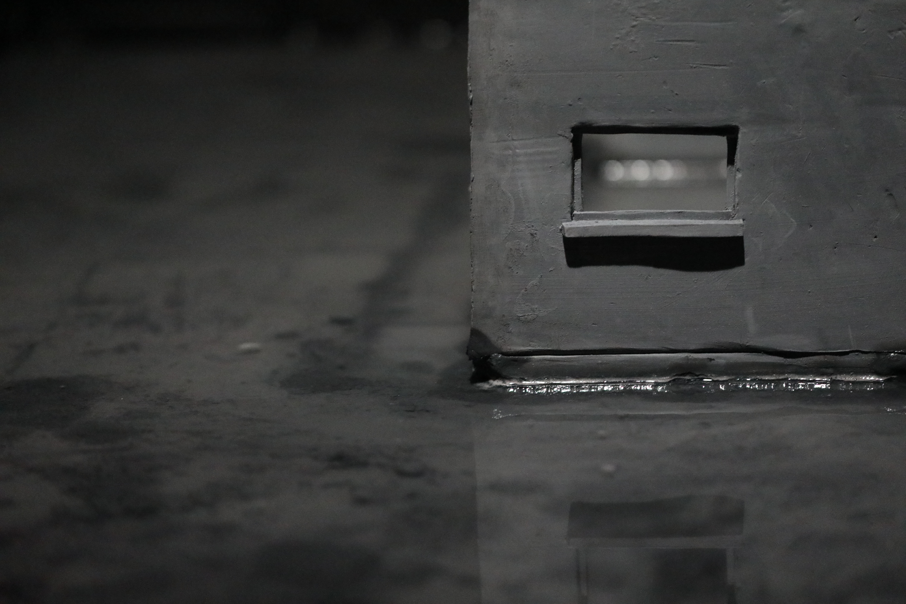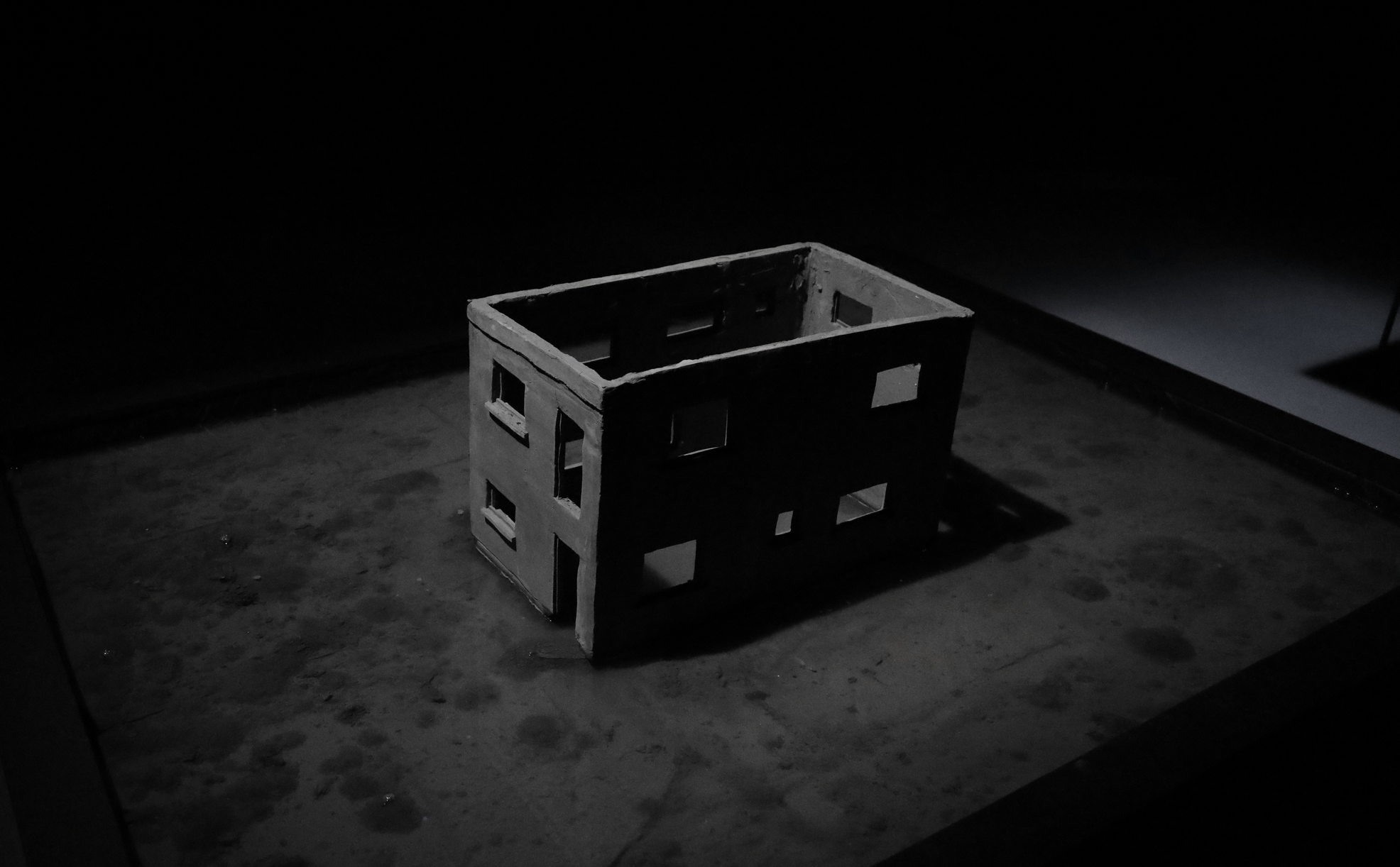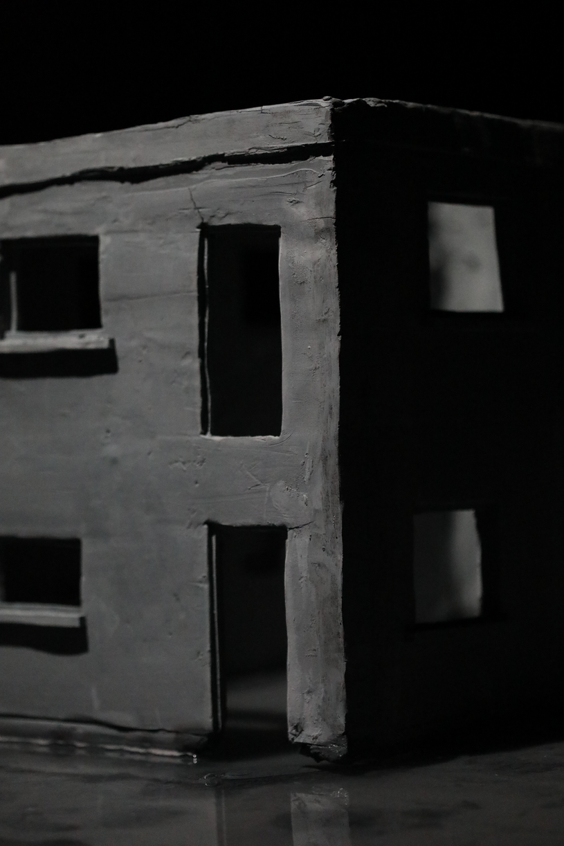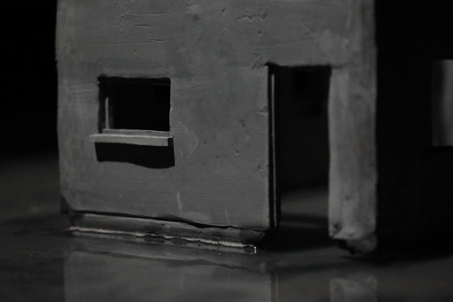 Dans une salle aux murs noirs, deux pièces sculpturales sont plongées dans l’obscurité. Un fin éclairage froid les éclaire. Les deux pièces sont alignées. La première est un bâtiment miniature, que l’on qualifierait de bâtiment nord-Américain. La pièce est en argile, de couleurs est un gris pâle. Il manque toutes les portes et les toutes les fenêtres à l’édifice, tout comme il manque le toit et les étages. Toutefois, le bâtiment n’est pas abîmé. Celui-baigne dans un grand bassin d’eau, surélevé à environ un pied et demi du sol. Dans le bassin, l’on peut discerner le fond de celui-ci, car une matière, une sorte de boue repose au fond de l’eau. Cette boue est presque de la même couleur que le bâtiment. Si l’on regarde attentivement, l’on peut dénoter que le bâtiment est tranquillement entrain de fondre dans le bassin, des morceaux de la fondation s’étant dissout dans l’eau.