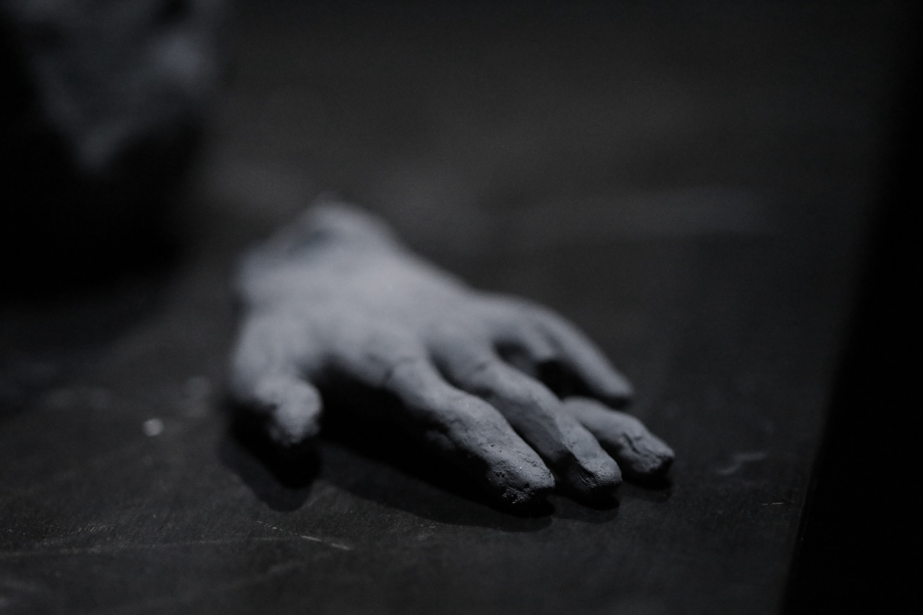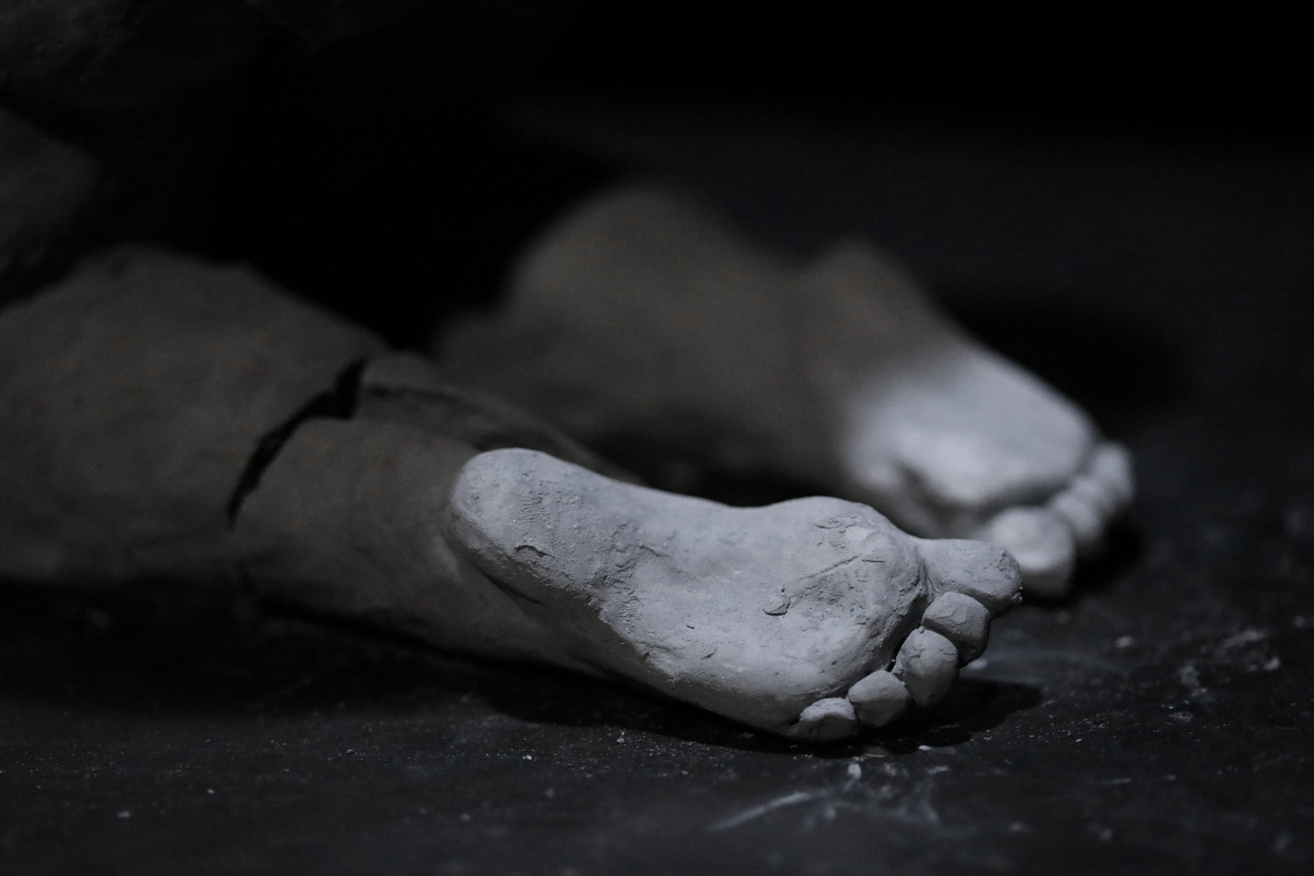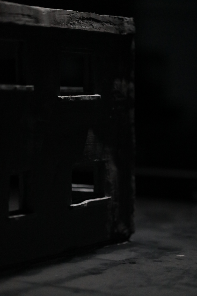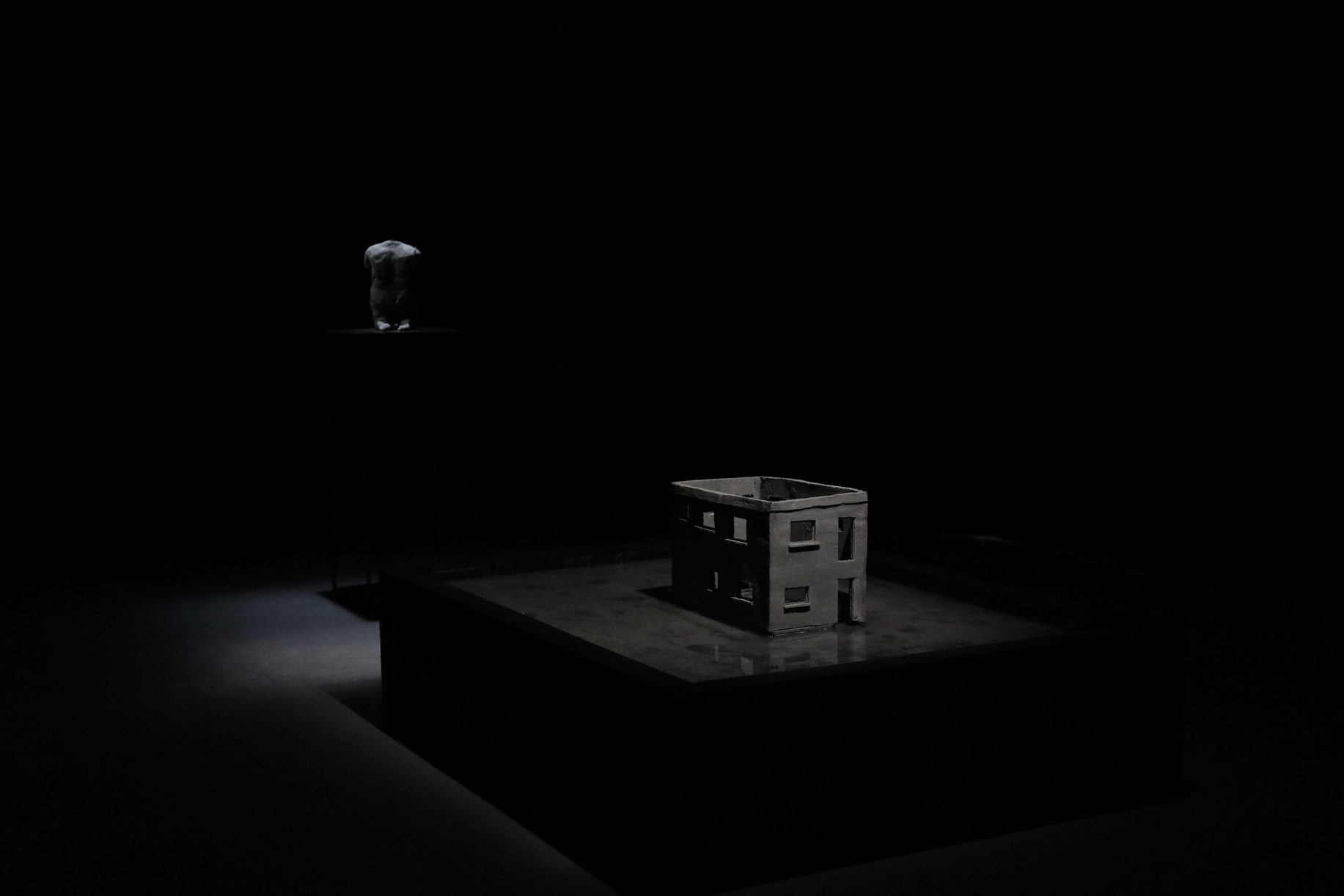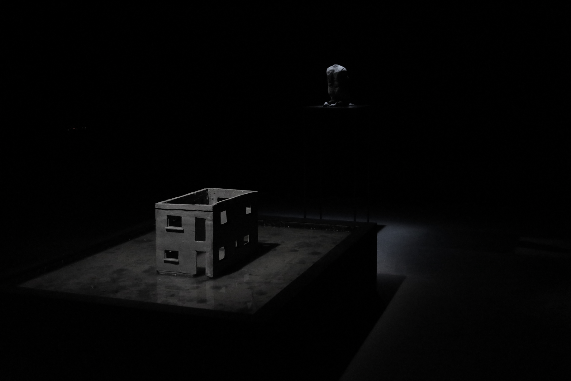 Dans une salle aux murs noirs, deux pièces sculpturales sont plongées dans l’obscurité. Un fin éclairage froid les éclaire. Les deux pièces sont alignées. La première est un bâtiment miniature, que l’on qualifierait de bâtiment nord-Américain. La pièce est en argile, de couleurs est un gris pâle. Il manque toutes les portes et les toutes les fenêtres à l’édifice, tout comme il manque le toit et les étages. Toutefois, le bâtiment n’est pas abîmé. Celui-baigne dans un grand bassin d’eau, surélevé à environ un pied et demi du sol. Dans le bassin, l’on peut discerner le fond de celui-ci, car une matière, une sorte de boue repose au fond de l’eau. Cette boue est presque de la même couleur que le bâtiment. Si l’on regarde attentivement, l’on peut dénoter que le bâtiment est tranquillement entrain de fondre dans le bassin, des morceaux de la fondation s’étant dissout dans l’eau.