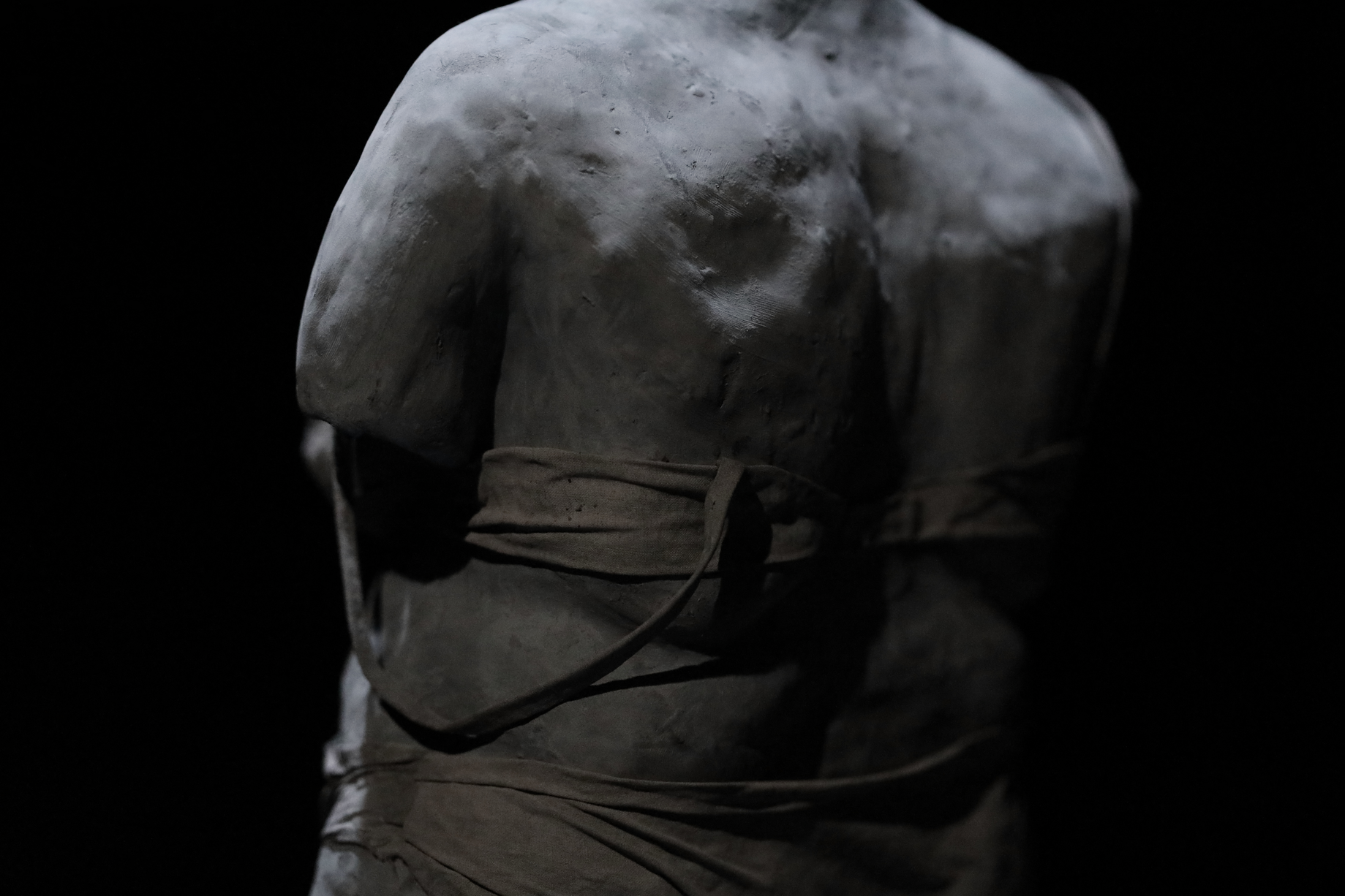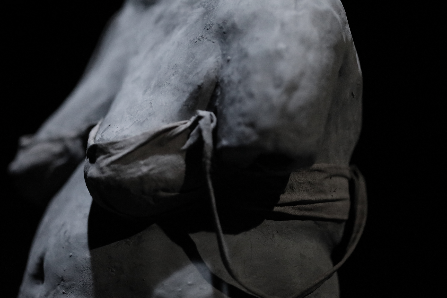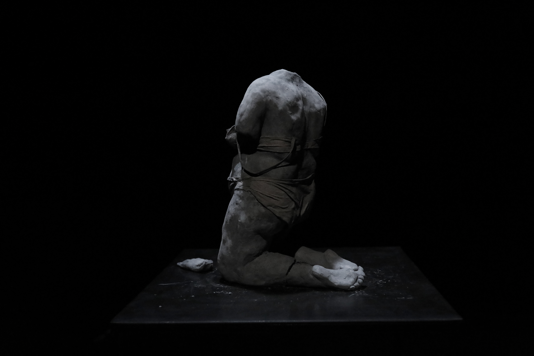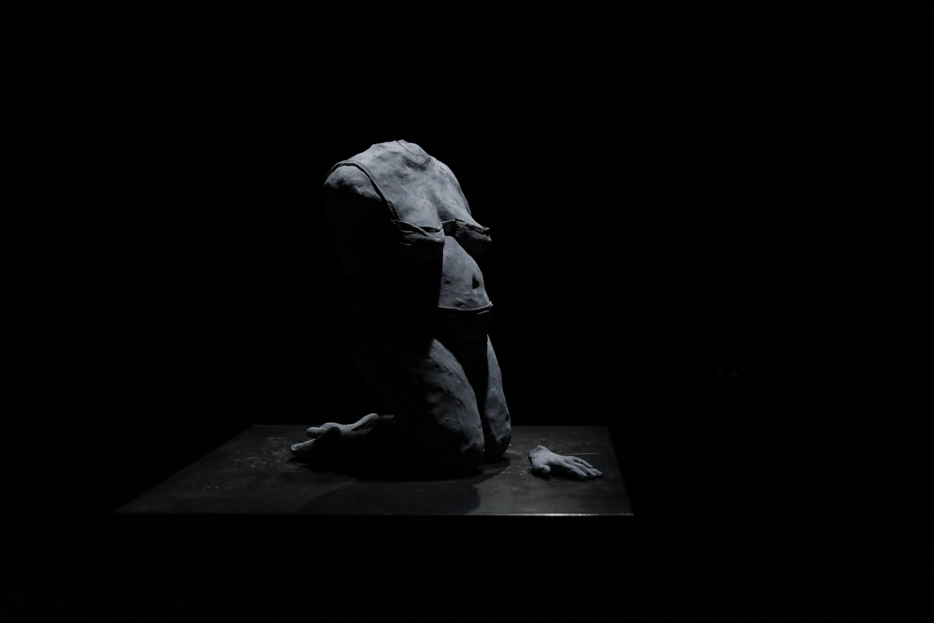 Derrière le bassin l’on retrouve une autre sculpture, celle-ci placé sur un socle en métal. C’est un corps de femme, à genoux, faisant dos au bâtiment. Celle-ci est en sous-vêtement et il lui manque ses deux bras. Elle possède ses deux jambes, mais l’une est craquée au niveau du mollet et donc le pied gauche bascule un peu vers l’intérieur. Devant le corps, une main est déposée baume contre sol. La main possède la même échelle que le corps, l’annulaire s’est craqué, il est décollé du reste de la main. Le corps n’est pas de la même échelle que le bâtiment, le bâtiment étant beaucoup plus petit.