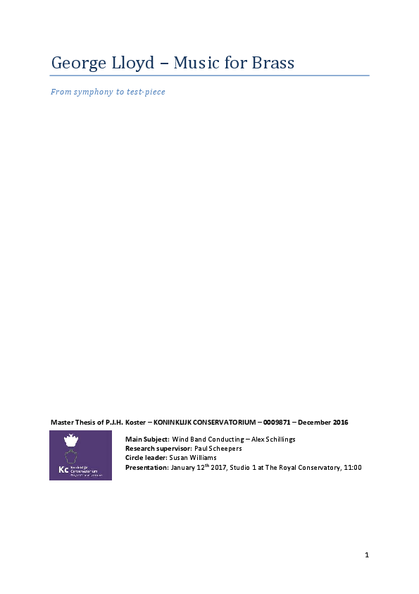 Name: Pieter Koster Main Subject: Wind band Conducting Research Supervisor: Paul Scheepers Title of Research: George Lloyd – Music for brass, from symphony to test-piece Research Questions: 1. Did George Lloyd change his way of composing from Symphony no. 10 via Royal Parks to Diversions on a Bass Theme? a. In what way does George Lloyd treat the following compositional elements in each piece? i. Structure ii.Harmony iii.Thematic material iv. Musical Tension b. In what way does the treatment of these elements differ in each piece? 2. Did George Lloyd succeed in combining his own views with the demands of the test-piece commissions, to write an appropriate test-piece? Summary of Results: Cornish symphonic and opera composer George Lloyd has written several compositions for brass, starting with a symphony for brass ensemble (Symphony no. 10) and then several test-pieces for brass band. The commission of test-pieces for brass band contests appears to be guided only by implicit criteria for these sort of compositions. Lloyd’s first test-piece, Royal Parks, apparently did not meet the criteria and his second test-piece, Diversions on a Bass Theme, did. This thesis investigates if George Lloyd changed his way of composing to write an appropriate test-piece, by a detailed analysis of Symphony no. 10, Royal Parks and Diversions on a Bass Theme. Besides that the thesis will try to answer the question if Lloyd was able to combine his own musical views with the demands of the test-piece commissions. The main findings are that Lloyd remained within his own musical language when writing the test-pieces, however he made some decisive choices regarding structure, form and thematic material that influenced the compositions significantly. He did partially succeed in combining his own views with the demands of the test-piece commissions. Biography: Pieter Koster (1985) completed his Bachelor’s Degrees at the Royal Conservatory in The Hague as a student of Ad van Zon on the trumpet, and Alex Schillings for conducting. In September 2016 he successfully completed his Master-exam concert with the Bundes Polizeiochester München. Pieter has participated in multiple conducting courses with renowned (professional) orchestras and teachers. Today he is professional conductor of the fanfare orchestras ‘Ons Genoegen’ Hattem, ‘Wilhelmina’ Volendam and the Koninklijke Brassband Utrecht. He is also a brass teacher for numerous students. Since 2014 he is secretary and member of the board of the Dutch Association of Wind band Conductors (Bond van Orkestdirigenten en Instructeurs).