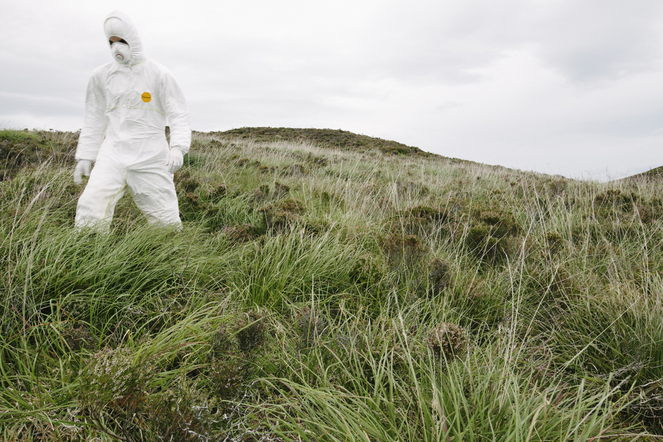 The gear I donned the following morning as I boarded the boat heading for Gruinard Island revealed a key feature of my performative procedure of becoming-inside: a filtering dust mask 6360V, FFP3, with valve, 5/VE, and a DuPont Easysafe disposable protective suit, type 5/6, Cat. III, polyethylene fleece, size M. Paradoxically, it was precisely this protective second skin and this protective extension of my bodily respiratory system that was indeed necessary to face the island and its environment. For what was made clear here was nothing less than “the basic idea of terrorism in the more explicit sense” (Sloterdijk 2009, 14). Here, on Gruinard Island in July 1942, scientists from the British research institution Porton Down worked on the development of a military apparatus trying “to disseminate an aerosol of lung-retention size particles from a liquid suspension of bacteria in a bursting ammunition such as a bomb, delivered so that effective concentrations would be inhaled by anyone in the target area” (Carter 1992, 68). To test this airborne weapon and its invisible destructive power under real conditions before its planned application against Nazi Germany, the bacteriologists chose Gruinard Island to detonate several explosive devices with spores of Bacillus anthracis – nonhuman carriers of the highly infectious and lethal disease anthrax. The experiments, which lasted only for a few days, were of such otherness and deadly potential that, not only did the flocks of sheep specially positioned for the verification of the weapon’s efficiency quickly die, but also, the entire ecology of the island transformed into an isolated, restricted area to this very day. While, between 1986 and 1988, the traumatized biome of Gruinard Island was thoroughly decontaminated using several million litres of seawater and dissolved formaldehyde, its transformation into an illusionary normalized landscape has not succeeded: “The danger to humans and livestock remains undiminished and may persist for centuries; no one knows for sure” (Cole 1988, 23). Despite the darkness and atrocity emanating from this place, when I set foot on the stony sandbank of Gruinard Island, it was as if the transformed air that surrounded me in that first moment of encounter did not strive to kill me, but instead embedded me in an aerial in-side space in which I became part of an interspecific dialogue with the traumatized ecology of the island. Here I realized that it was the trauma that made me hope, the danger that made me feel safe, and the protective second skin that made me develop a new concept of my body. I began, still cautiously, to enter the daylit night and to start breathing non-air.