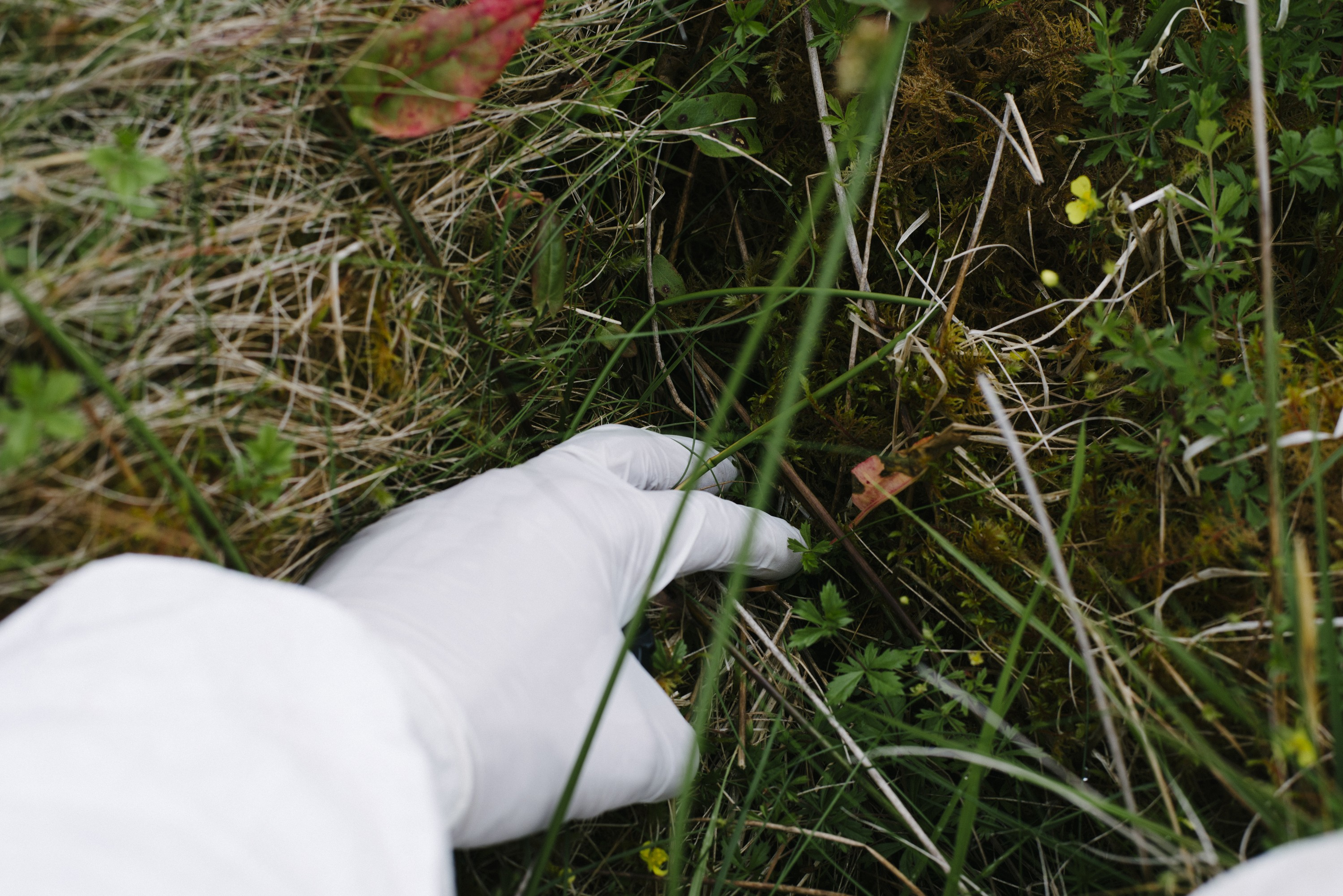 I had not prepared any performative vocabulary for encountering this dark ecology and the different way of breathing in its atmosphere. The awareness of being present here with my body and opening my physical boundaries to the unfamiliarity of the Other and the interspecific dialogue with the deadly spores of Bacillus anthracis was already enough. Nevertheless, embedded in this ambivalent environment, my actions were specific: rituals and micro-interventions that emerged intuitively, which only came into being in the somatic encounter with the island’s ambivalent spheres. An essential ritual was walking. But this walking was not merely moving forward, but a gradual fusion with the island’s soil layers. This place’s vegetation did not consist of any flat solid ground, but resembled a foam, into which I sank knee-deep, sometimes hip-deep. I immediately remembered Gilles Deleuze (1994): “This ground which is now on the surface is called depth or groundlessness” (275). As I continued my steps through this groundlessness, I also became aware that my walking meant a “walking-with” (Springgay and Truman 2019, xiii), in which a momentary togetherness and carriance occurred between me and the Other. With every step through the dense and deep vegetation of Gruinard Island, my feet not only pushed through the bushes, but a short moment later sank into the wet earth, which was repeatedly crossed by densely veined rivulets. My feet got wet and were the first limbs to approach the spore-saturated ground. Following Edmond Jabès, my steps and my dialogical walking were similar to “a subversive murmur, which emerges onto, or butts against a threshold where we are afraid, which emerges onto that very threshold which is the intimate” (Ettinger 1993, 31). But this intimate encounter with the fearful threshold occurred not only through my feet and legs but also in my mouth and nostrils. I began to dive into this groundless ground and to absorb the groundless air. With each of my steps and breaths, my perception – my aesthetic sensation – seemed to grow, and the place’s intensity increased. I looked around me, gazing into the droning aerial turbulences and feeling the earthy trickles that – snakelike – flowed through my protective, artificial skin. I noticed how Celan’s waterneedles had woven me into an incredibly dense, breathtaking web.