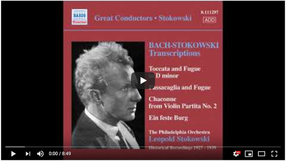[21]Bach/Stokowski, Toccata and Fugue in d-minor, released on Bach-Stokowski Transcriptions (Historical Recordings 1927–1939) (Hong Kong: Naxos Historical, 2008).