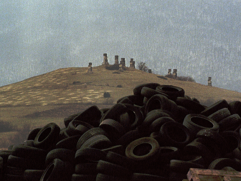 In March 2015 I was filming a pile of tires in the backyard of a car service station in the town of Bihać. For someone growing up in Cyprus truck tires are always subconsciously related to a borderline, a buffer zone. The sky was overcast, and some rubbish was burning on the bordering plot. As the wind was blowing from the north the smoke was carried through the frame. Shortly afterwards the sky cleared and the Garavice memorial was rendered visible. The erratic rays of sunshine gave the background a two-dimensional aspect, transforming it into a backdrop, as it were. It was only weeks afterwards that I had the processed film in my hands and its images on screen. The tires, the smoke, the dotted light like paint dabbed onto the hill, the stone blocks: all these elements came unintentionally together to create a scene that viewers of the film would later call evocative. True, maybe, but evocative of what?