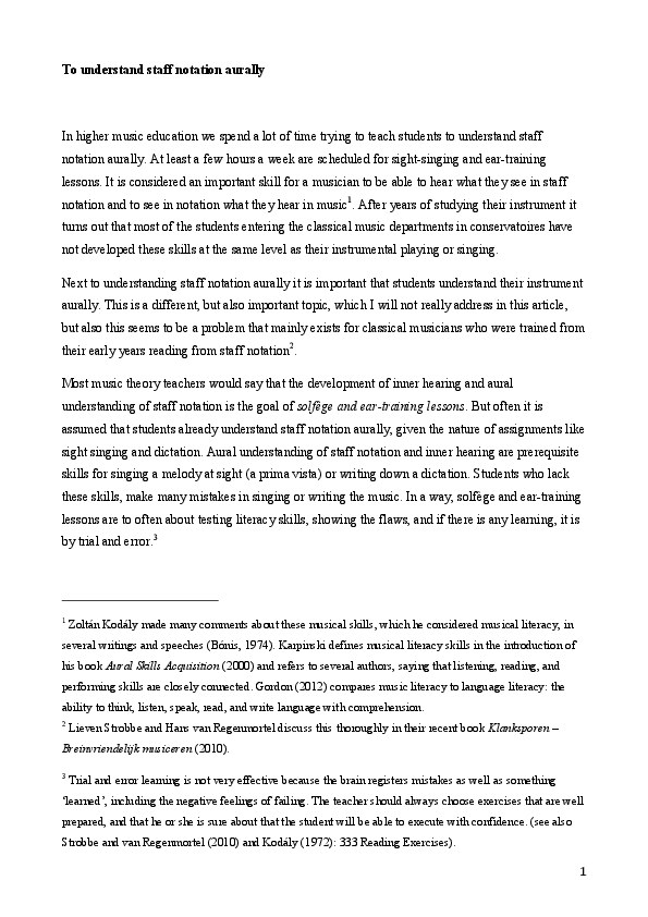 Name: Suzanne Konings Main subject: Master of Music Theory Research coach: Lázsló Nemes Title of research: What's in a name? The relation between pitch notation, note names and sight singing in different forms of pitch notation and in different ways of approaching pitch notation Research questions: Are absolute note names necessary in sight singing, when reading pitch notation on the stave relatively? Mental process: one sees ‘do’ (a name that indicates a function) and thinks ‘F’ (indicating a pitch). Are relative note names necessary in sight singing, when reading pitch notation on the stave ‘absolute’? Mental process: one sees ‘F’ (a name that indicates a pitch) and thinks ‘do’ (indicating a function). Abstract: Sight singing is a part of almost every music theory curriculum in conservatoires. But one might ask oneself why lessons in sight singing are needed for students who can already read music notation? The answer usually is: to develop the aural imagination in relation to music notation. The way students have learned to read music notation in the first place did not develop this skill well enough then? Experiences in teaching made me think that we need functional note names (unique sound names) to be able to aurally understand pitch in staff notation, and that the absolute note names (unique pitch names) may be an instrumentally useful, but less effective step ‘in between’ in aural imagination. From existing literature and recorded tests with students performing special designed scores I hoped to learn more about connecting the inner hearing world to music notation in the most effective way. Biography Suzanne Konings studied music theory and musicology and has been the head of the music theory department in the Royal Conservatoire The Hague since 2004. From 2009 she has been specialising in teaching music according to the Kodály concept. Together with colleagues in and outside the conservatoire she is organising training programmes for teachers and musicians in elementary schools, music schools and higher music education. She teaches musicianship classes for students in the Royal Conservatoire and the National Youth Choir of the Netherlands.