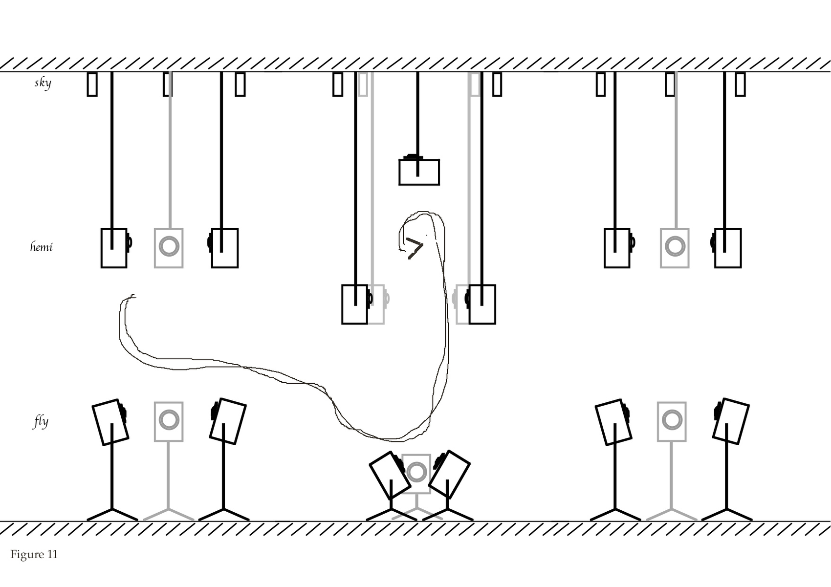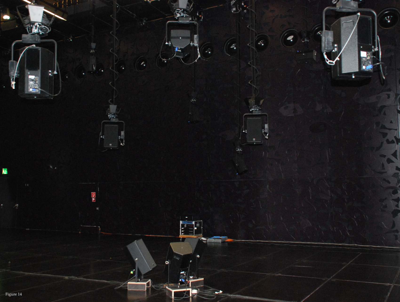 This complex structure has proved to be a rich potential basis for research and for the composition of music with the types of sound-structures I wanted to work with. The exact design of heights, tilts, orientations and, wherever applicable, positions, has been a long process, searching to avoid certain reflections, looking for coherence and also to potentiate and enhance the multi-functionalities that each sub-structure would have to fulfill, evolving with the musical ideas. Figure 10 shows the exact heights and tilts at the final setup. Figure 11 (Tree 1), Figure 12 (Tree 2) and Figures 13 & 14 (Tree 3) show pictures of these structures in the Hall. It is really difficult to photograph the speakers in the Ligeti Hall, so in order to give some impression of their relative positions and orientations, at the time of taking the pictures I had to slightly lowered down the hemi-speakers, while keeping tilt and orientation.