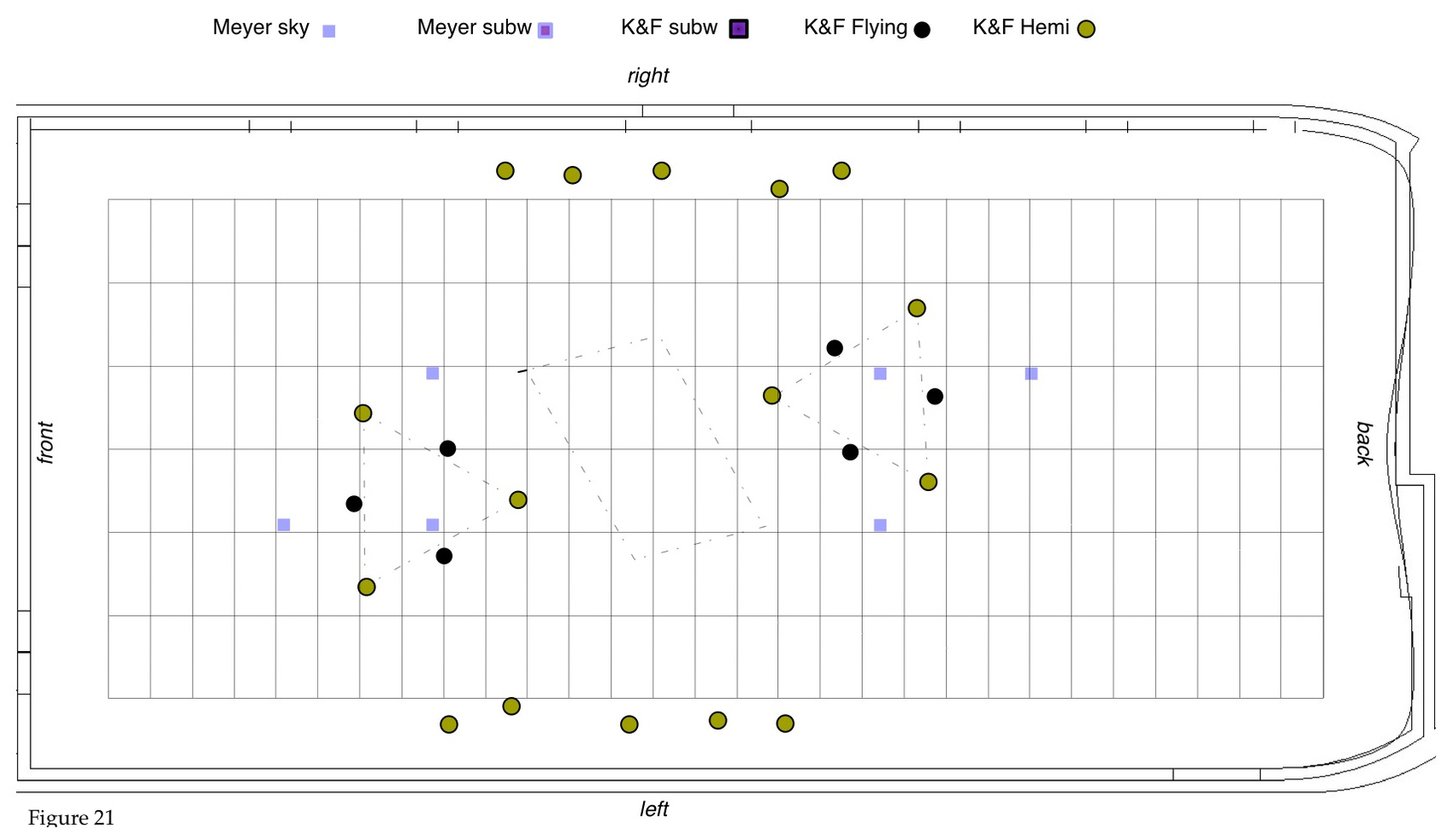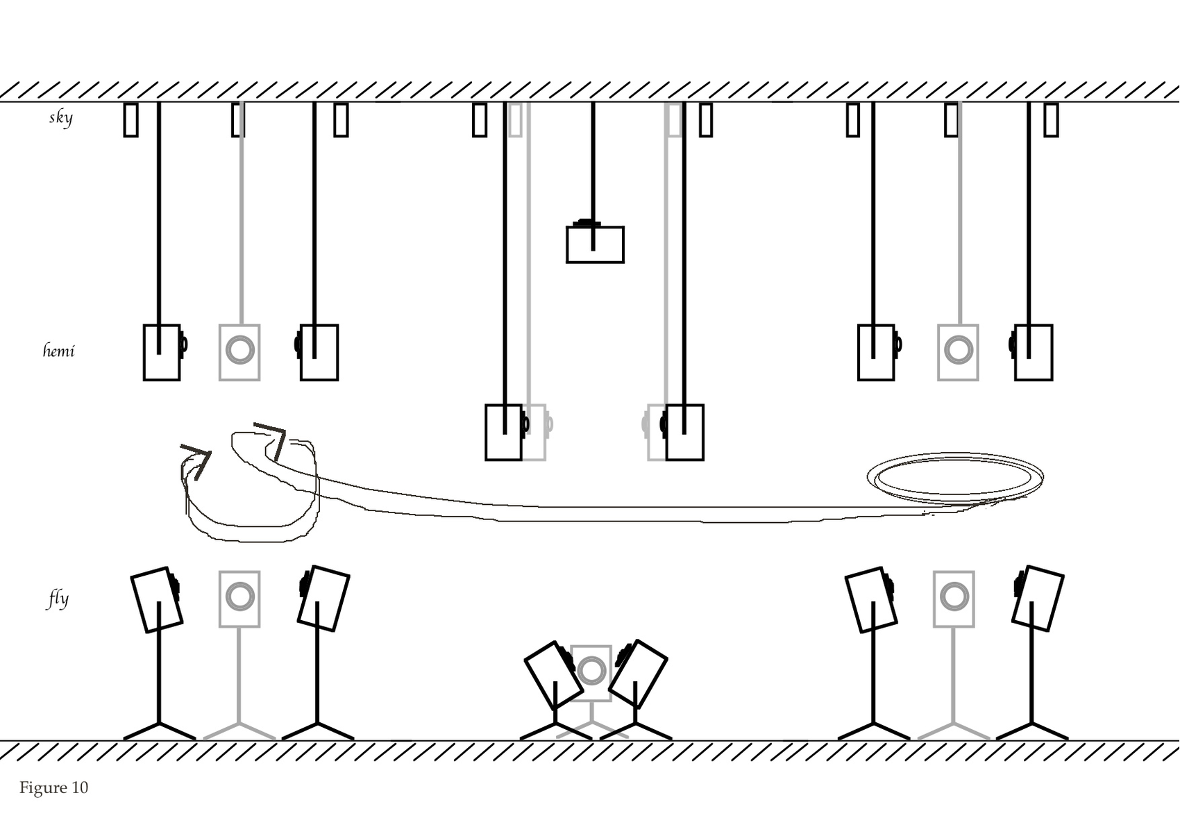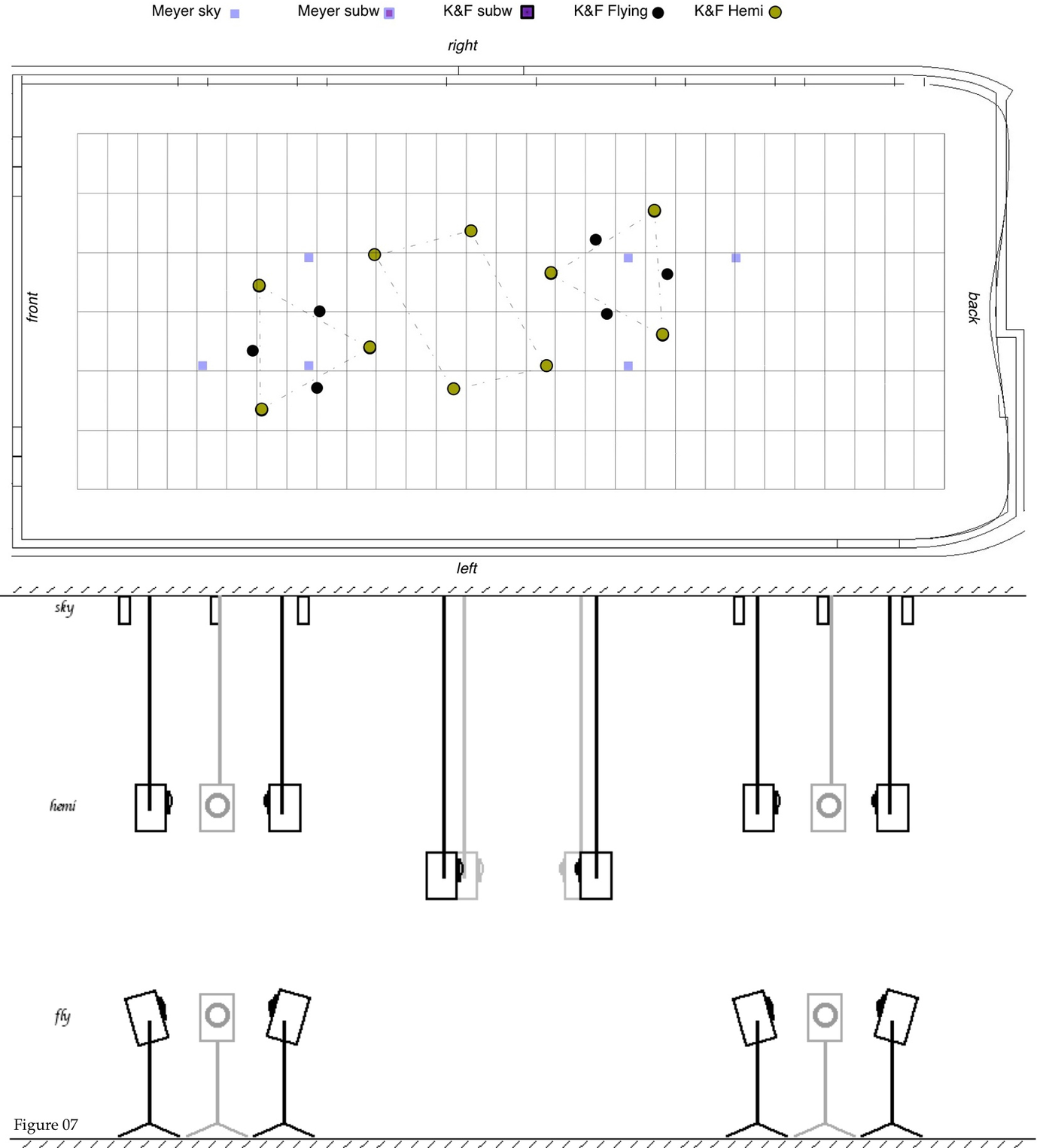 7. This whole setup of speakers was complemented with the sky-top speakers, addressed in different ad-hoc constellations. Figure 22, shows the whole structure of speakers (with only a choice of top-speakers for comprehensibility).