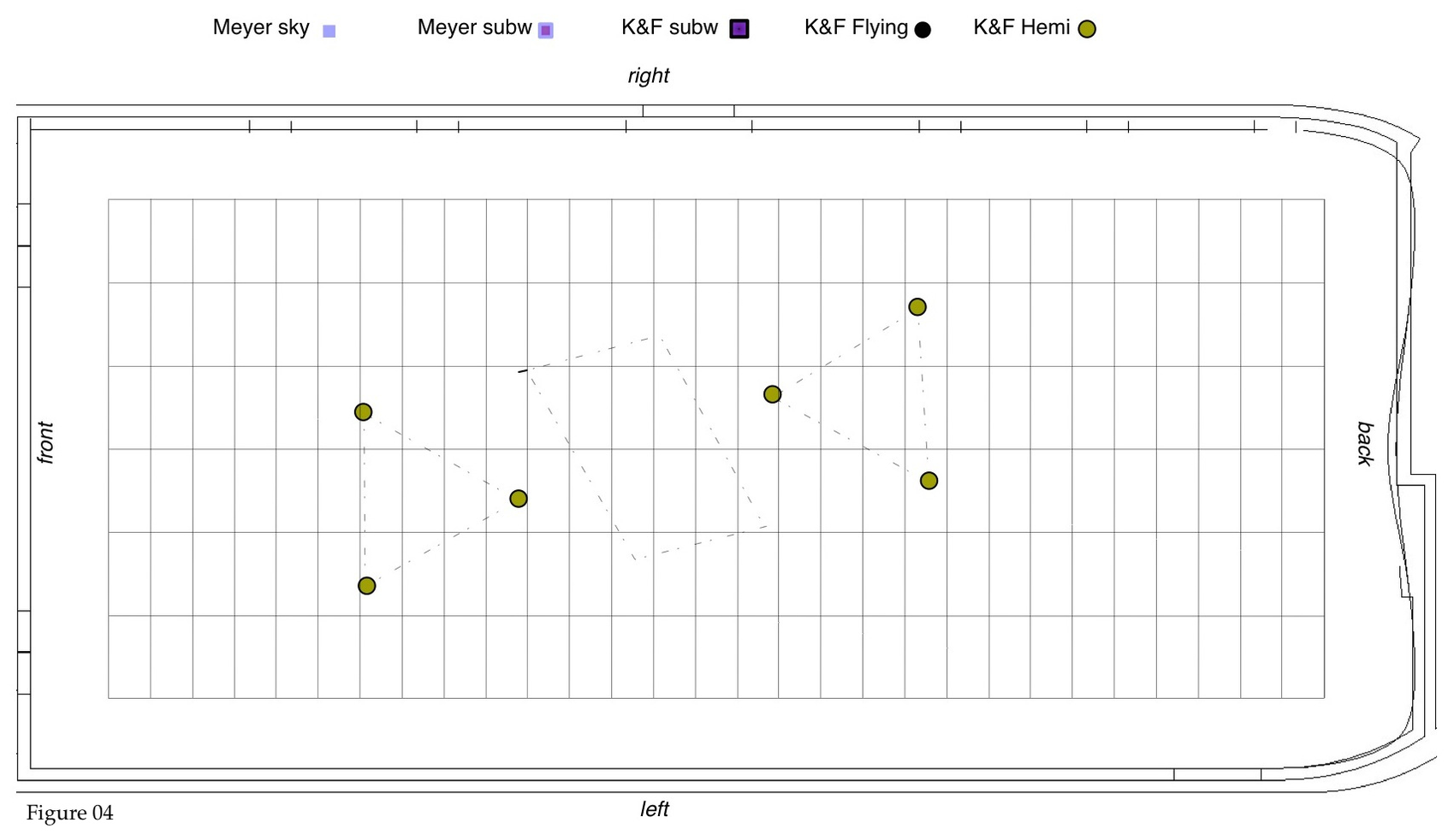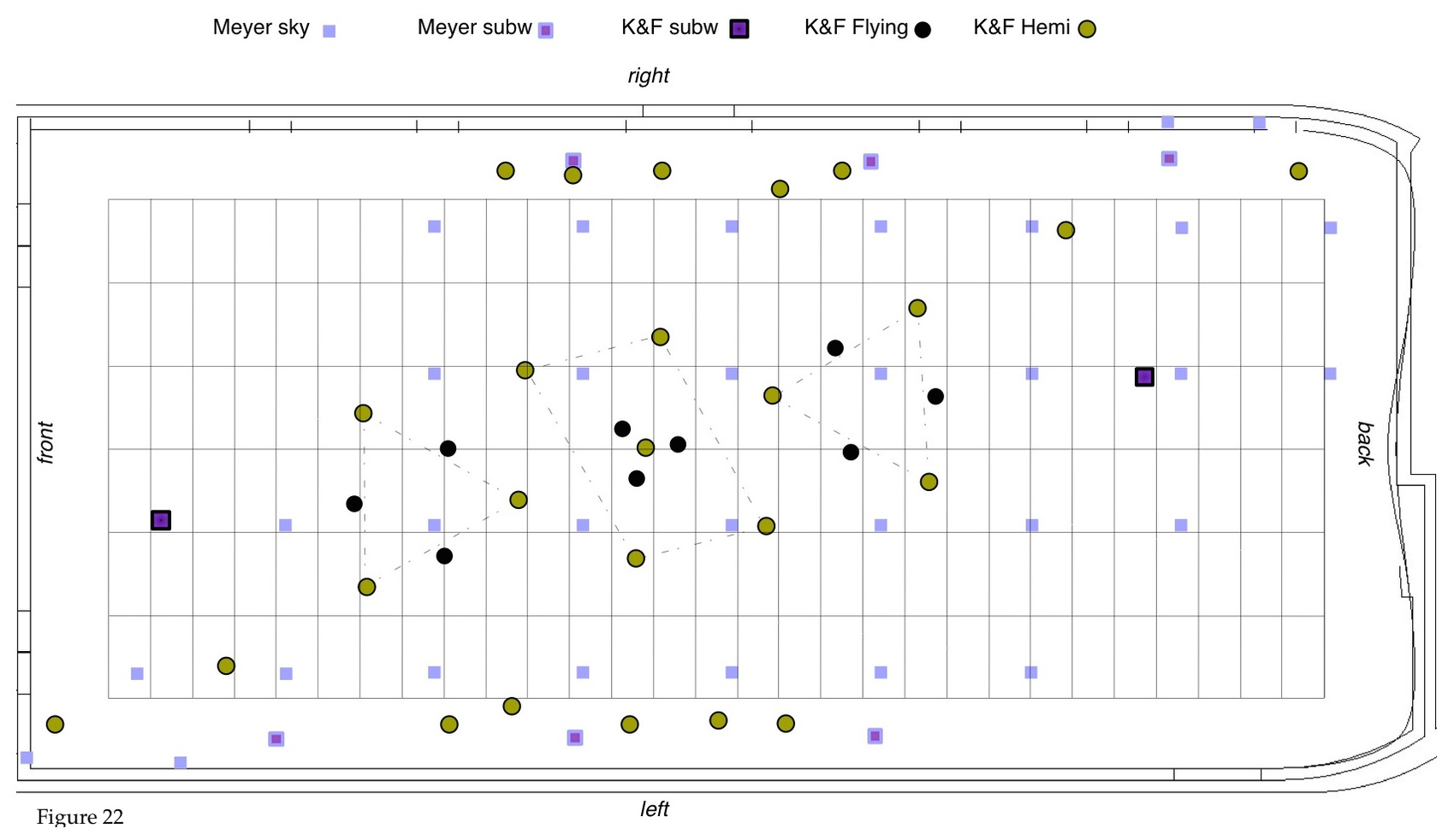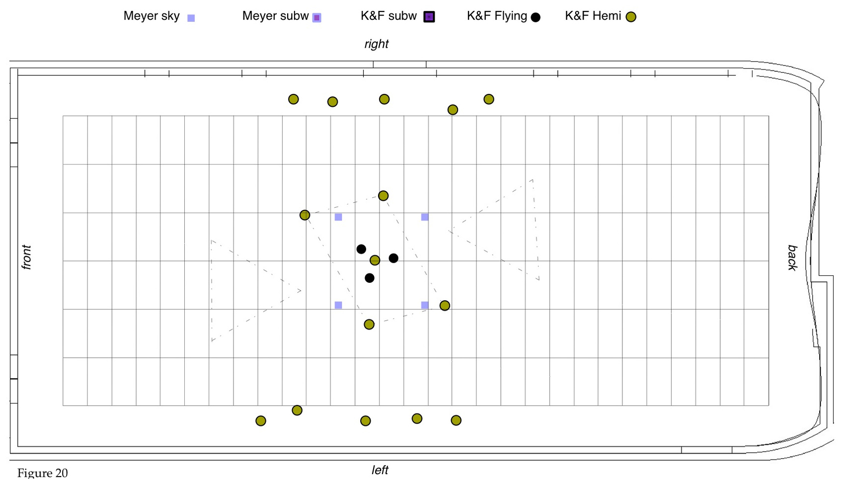7. This whole setup of speakers was complemented with the sky-top speakers, addressed in different ad-hoc constellations. Figure 22, shows the whole structure of speakers (with only a choice of top-speakers for comprehensibility).