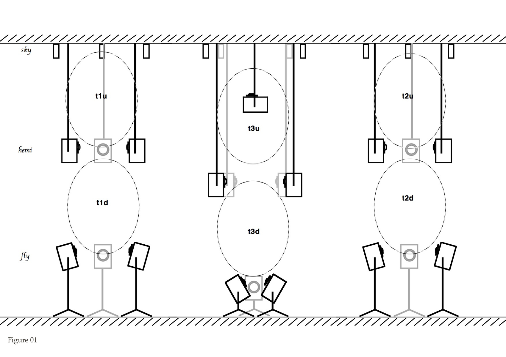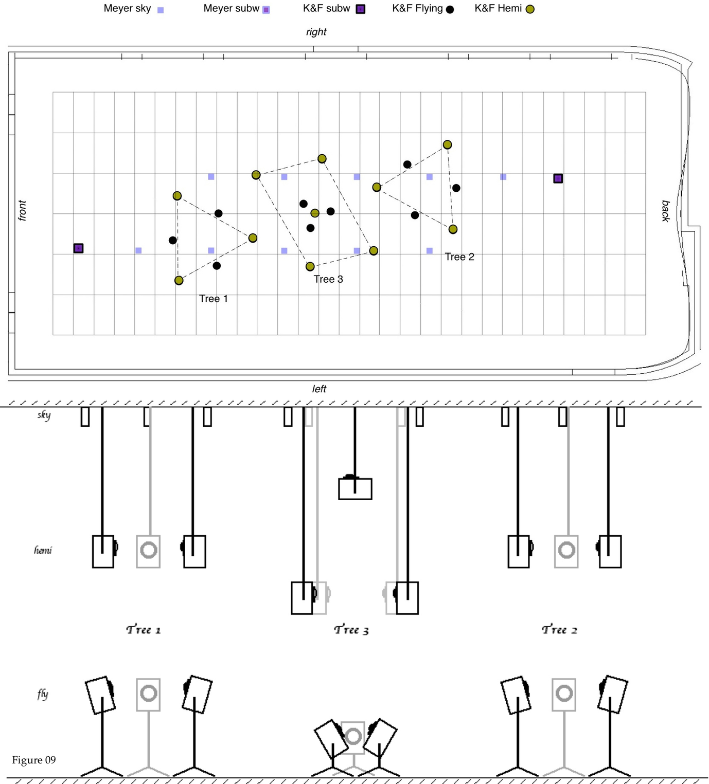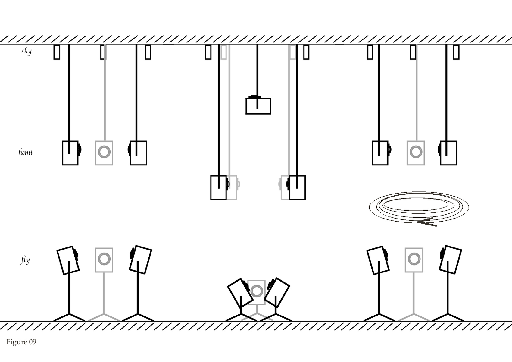 3. The idea of enhancing the boundaries between these two first structures, but also of favouring potential links and movements, of extending the possibilities through combinations of different type of sound-entities, led to the idea of a next intermediate surface, different and similar, by using four more hemi-speakers as in Figure 07. This very interesting new element, developed naturally further complementary extensions. First by adding a lower surface, as seen in Figure 08, with three more flying speakers, of the same type as the hemi's, on the floor. Later a higher surface, Figure 09, this time composed of four sky-top speakers reinforced with one central hemi-speaker looking upwards to add further consistency to the higher surface. As you see in this last figure, the nomenclature of the tree structures follows historical rather than geographical reasons.