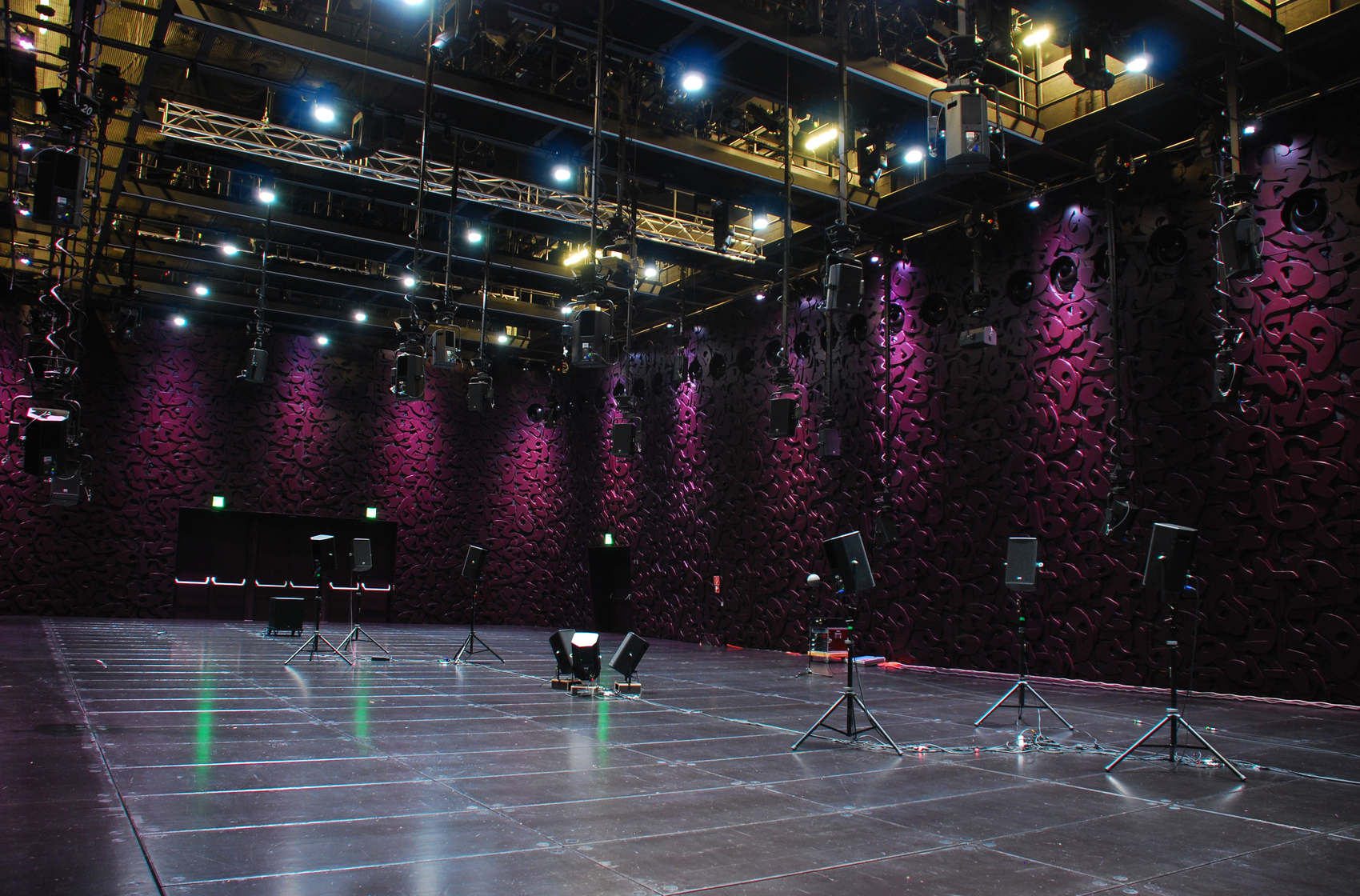 The whole Topoi setup comprises twenty-four from the thirty-three hemi-speakers at the Ligeti Hall, nine flying speakers on stands and two large sub-woofers on the floor, plus six from the eight sky-subwoofers on the ceiling, the whole sky-top (thirty-six) and another four sky-wall speakers. Not all of the sky-top speakers are used in one single performance, but they can be used, since the mapping of output speakers follows an algorithmic choice in some sections.