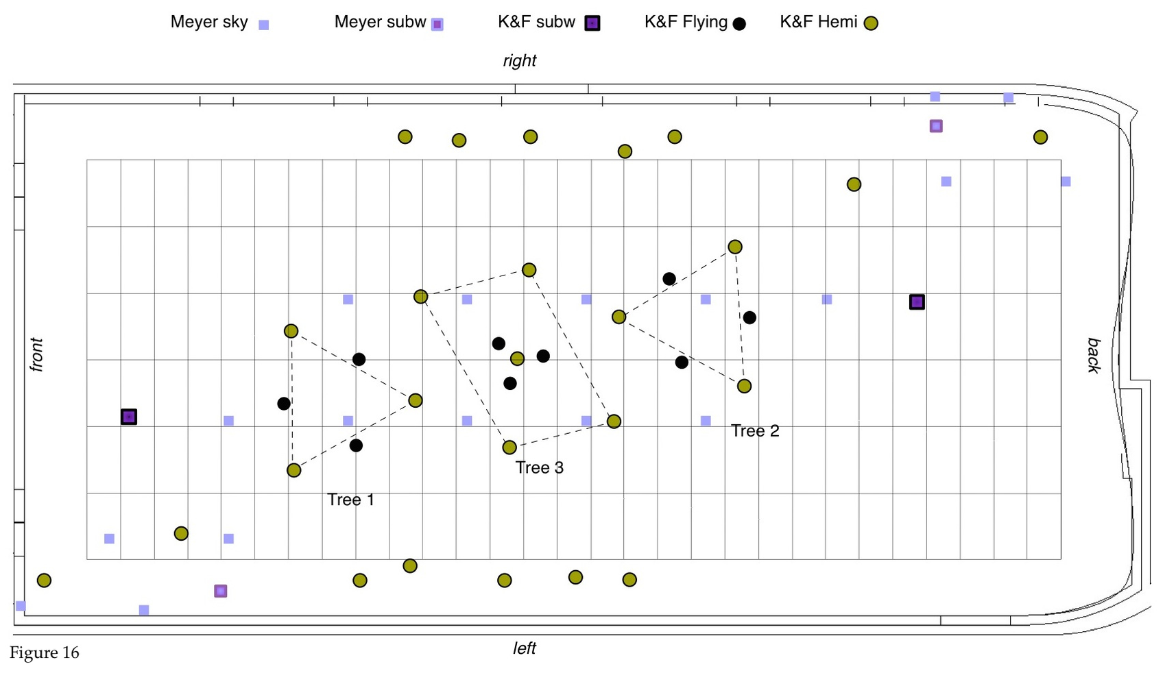 5. The first extension I just mentioned, the two sets of speakers at the corners are composed of a mixture of hemi, sky speakers and sky subwoofers. In Figure 17 I have isolated these double structure and added the lower third Tree, which serves as a transitional 'place". With this setup I could play with the idea of a pendulum across the Hall, which can be listened to at minute 07' 00" in the piece. It is impossible to photograph with any clarity this structure.