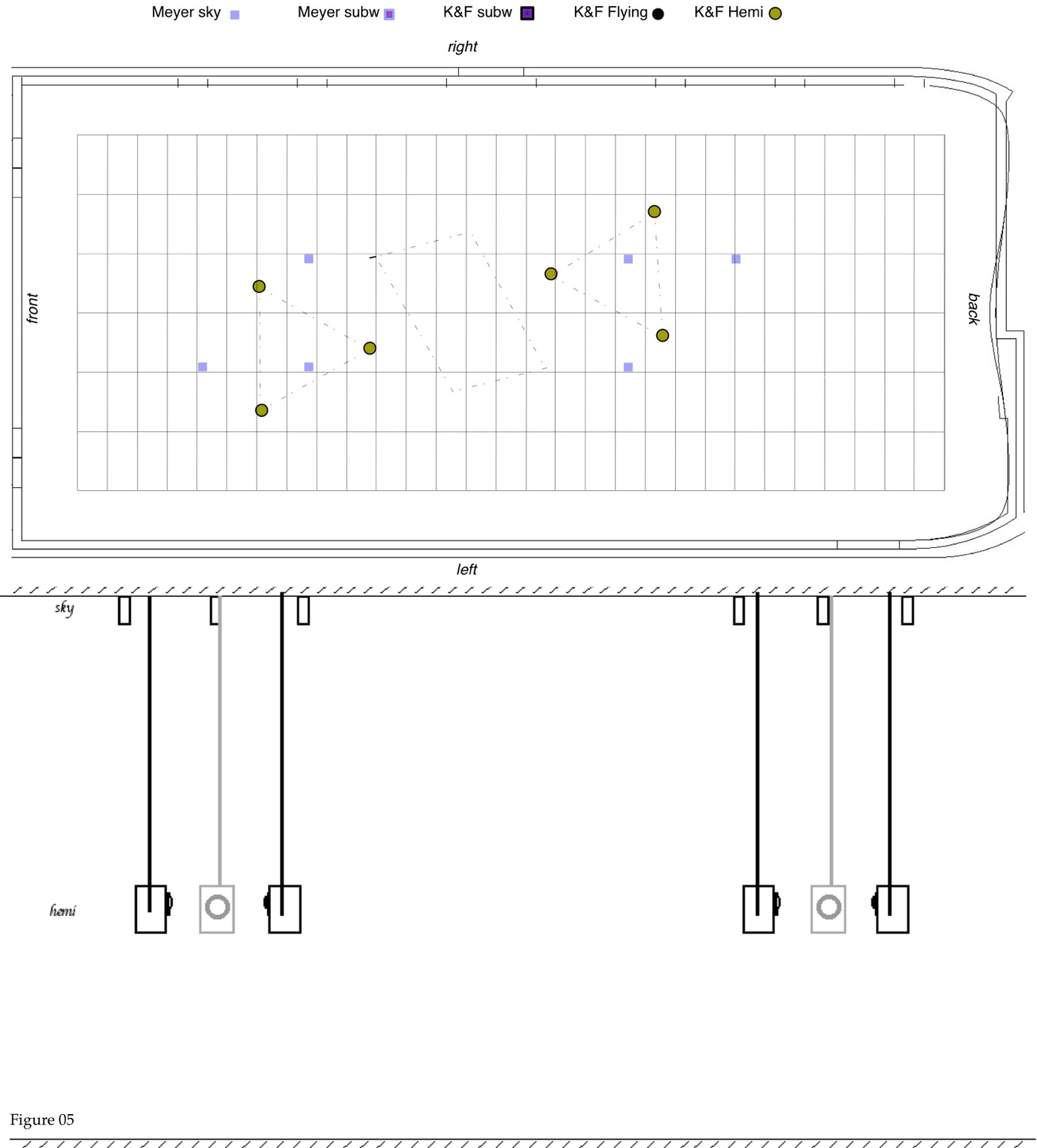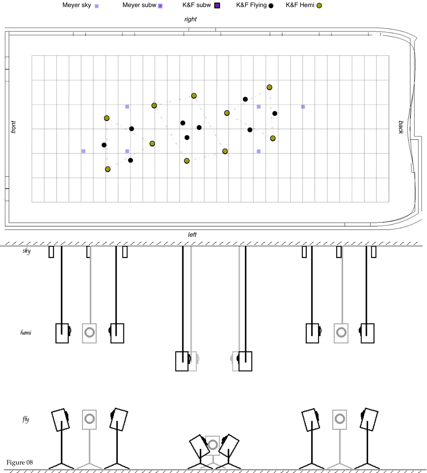 7. This whole setup of speakers was complemented with the sky-top speakers, addressed in different ad-hoc constellations. Figure 22, shows the whole structure of speakers (with only a choice of top-speakers for comprehensibility).