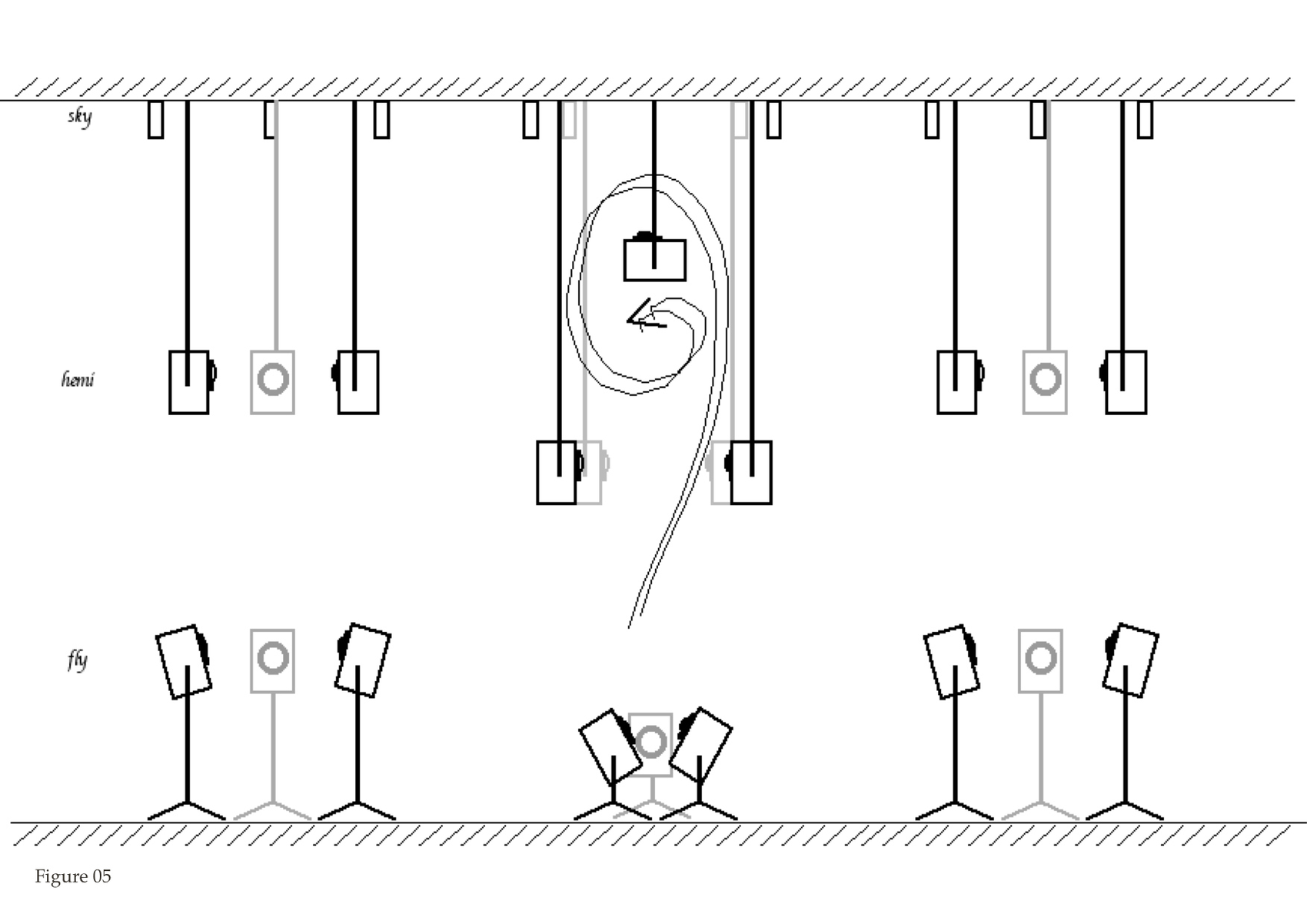 2. The next step was taken some time after, and included adding another double set of three speakers. This time I was using speakers of the same type as the hemi's, and placing them on stands on the floor at precisely defined positions. This is shown in Figure 06. This new configuration was much more powerful, controllable and implied a much larger vertical breadth while still assuring energy enough all along its height. I think it was at this time, that these speaker-structures got the nickname of trees, and the evolving study-case became familiarly known as the Two-tree (later Three-tree) piece.