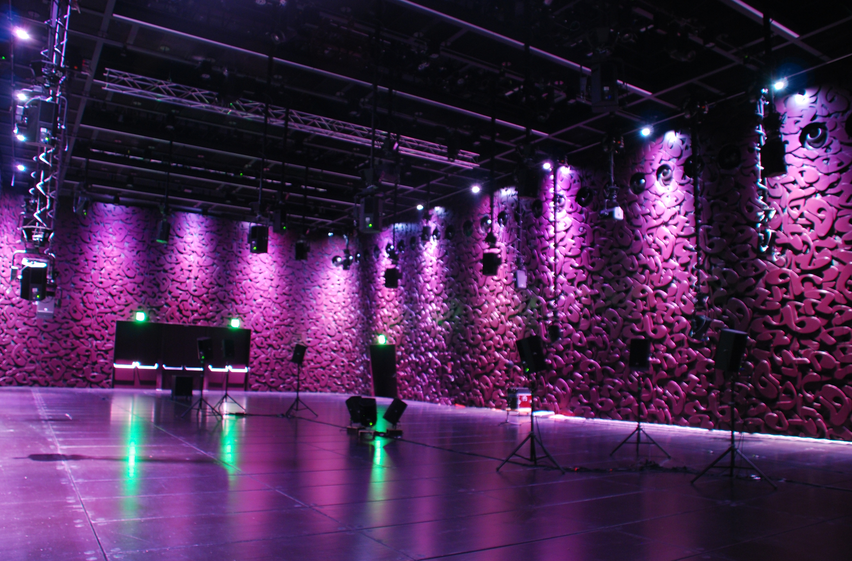 The whole Topoi setup comprises twenty-four from the thirty-three hemi-speakers at the Ligeti Hall, nine flying speakers on stands and two large sub-woofers on the floor, plus six from the eight sky-subwoofers on the ceiling, the whole sky-top (thirty-six) and another four sky-wall speakers. Not all of the sky-top speakers are used in one single performance, but they can be used, since the mapping of output speakers follows an algorithmic choice in some sections.