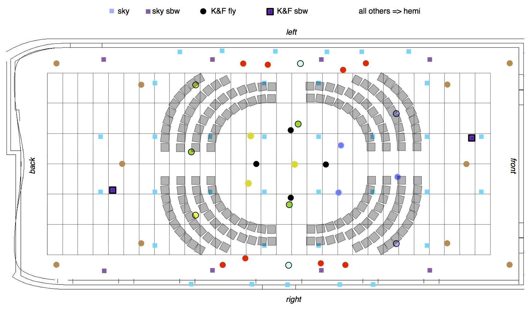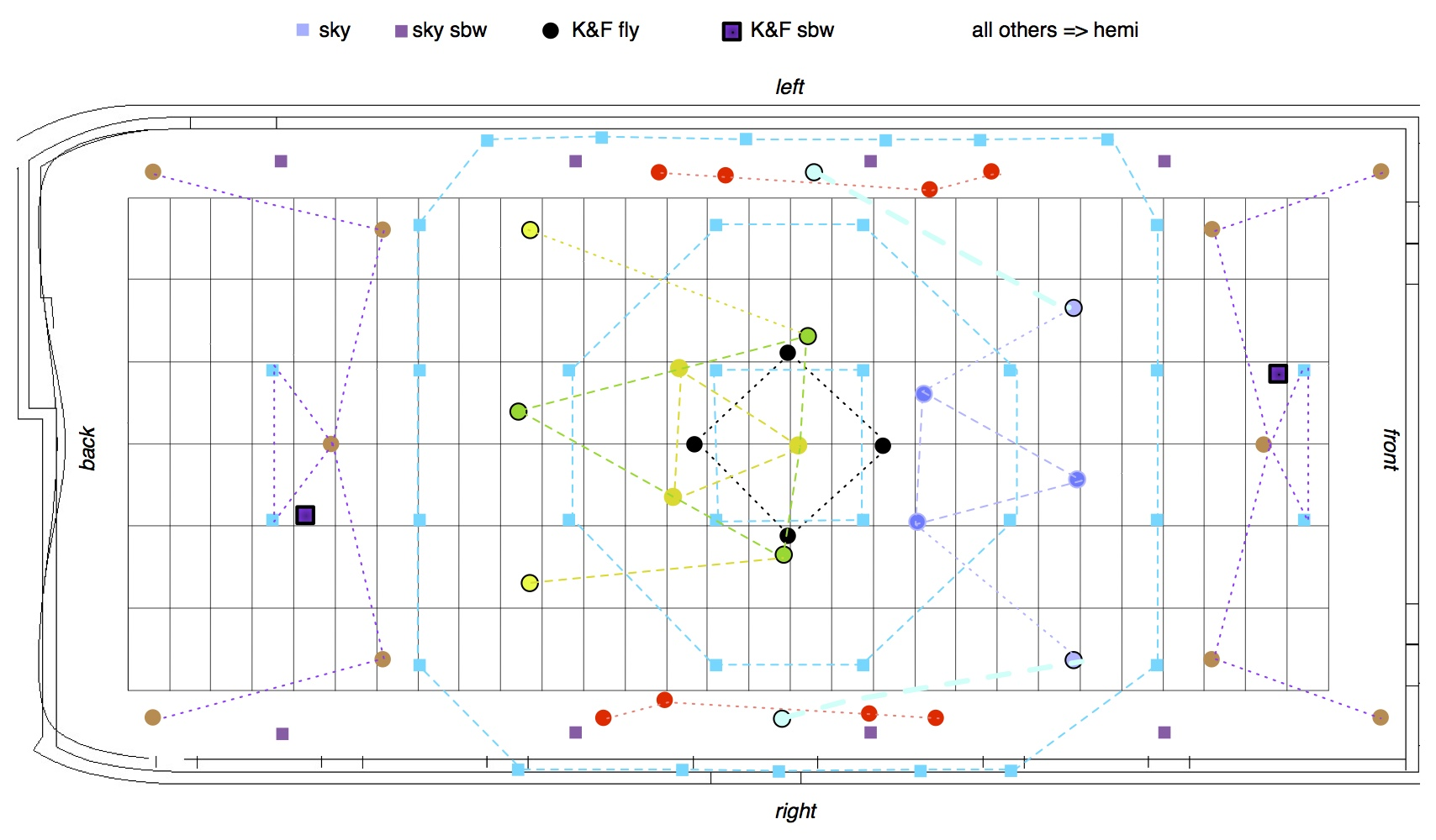 Fantasy uses all fixed speakers at the Ligeti Hall plus four additional ones standing on the floor in the middle of the room –exactly those that can be seen in the first photograph– and two large subwoofers. I had been designing and polishing this speaker-setup already for some time. Somehow it was more abstract and defying than had been the previous ones, less functionally oriented but very interesting and full of possibilities. I think this setup was attracting me so strongly that it became one of the main reasons to keep on with the idea of making one more last piece. The main idea, as expected, was to build a network of related places –potential 2d/3d containers defined through speakers at the boundaries– but as open as possible, so that different place-configurations could be designed from the given positions. In Figure 2 you may see most speakers (the sky is fully used, but I have not represented each single element of it) including a sketch, serving as algorithm, of the placement of the seats for the audience.