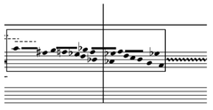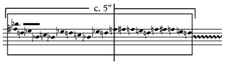 The score consists of a stave (for sounds of definite pitch) and a rectangular box (for sounds of indefinite pitch). Vertical lines are placed at intervals of five seconds. Noteheads and graphical symbols are spaced in proportional relation to their time span.