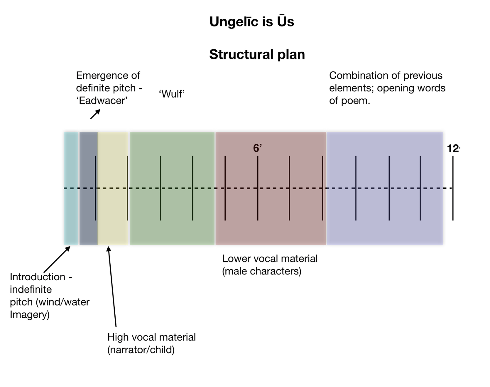 At a purely symbolic level, the six sections correspond to the six syllables of the refrain in its second version, ‘ungelīce is ūs’. The introductory section (up to 32”) uses almost entirely sounds of indefinite pitch, based on recorded samples of the spoken and sung text which have been transformed to allude to the watery, windswept landscape in which the poem is set. The second section (up to 1’04”) introduces material of a definite pitch, based on a sustained G note, and presents the name of one of the poem’s principal characters, Ēadwacer. The third section (up to 2'03”) further develops material of definite pitch, based on spectral analyses of the singer’s voice, in general no lower than the pitch of the G below middle C and thus within the average range of a female or juvenile male voice. In this way, this section alludes to the character of the female narrator and the unnamed child. The fourth section (up to 4’42”) develops cycling melismatic phrases based on the word Wulf, the name of the text's principal male character. The fifth section (up to 8’08"), develops recognisably vocal material of a lower pitch, alluding to the voices of the poem’s male characters. The final section was a deliberate attempt to combine elements that had already been heard, while introducing new ideas such as the opening half-line of the poem (at 8’26”), definite pitch material based on the motif (from 8'30"), and repeated, recited lines of the poem (from around 10’56”).