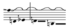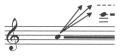 Sounds of definite pitch are represented by stemless noteheads on a stave, with thick horizontal lines indicating the duration of each pitch. All sounds of definite pitch are derived from samples of a singer’s voice. Many of these samples have been transposed and filtered in order to isolate particular partials. Consequently, the majority of these samples are not in equal temperament tuning. Microtonal pitches are notated as follows: