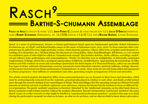 Rasch X is a series of mutational performances based upon two fundamental materials: Robert Schumann’s Kreisleriana op. 16 (1838), and Roland Barthes's essays on the music of Schumann, particularly focusing on ‘Rasch’ (1979), a text exclusively dedicated to Schumann’s Kreisleriana. To these materials other components may be added for every single particular version: visual elements (pictures, videos), other texts, or further aural elements (recordings or live-electronics).
