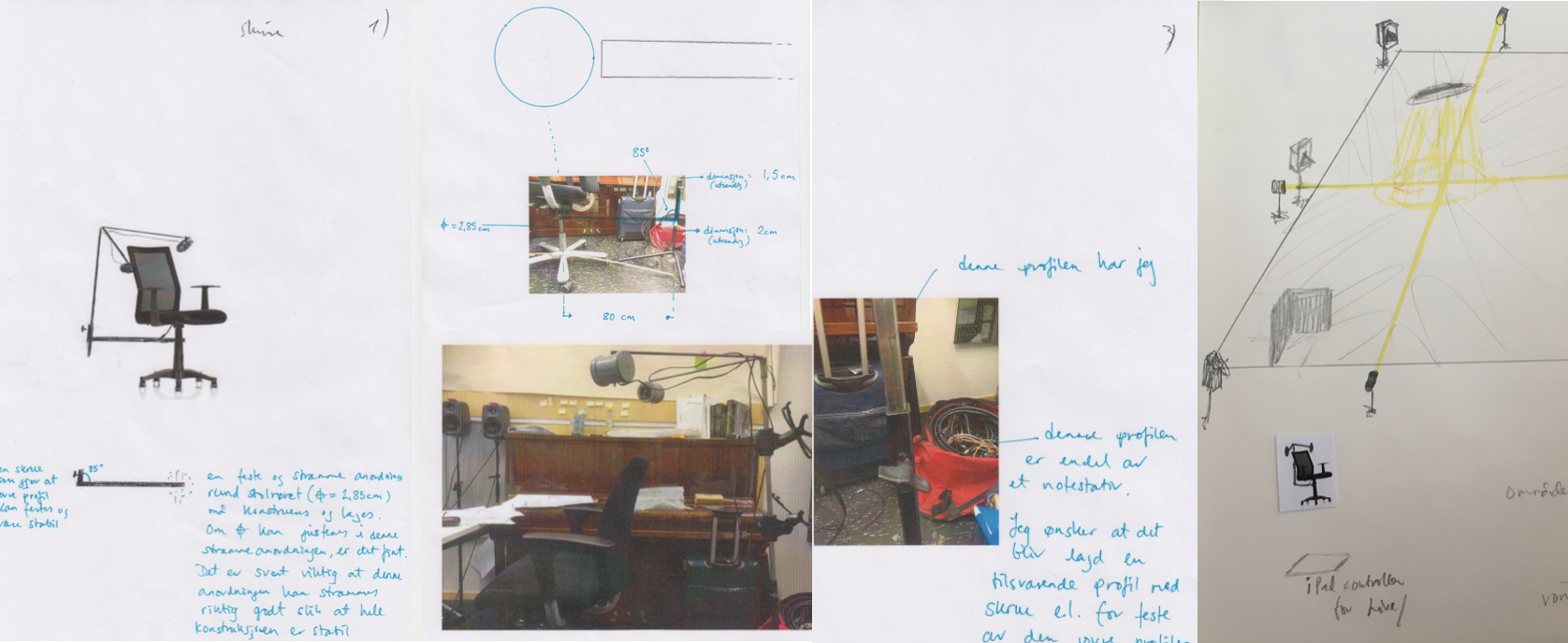 Noen dager senere begynte jeg å konstruere en anordning for nær-høyttalerne, oppheng for forsterker og to iPader som etterhvert ble sendt til sveising.