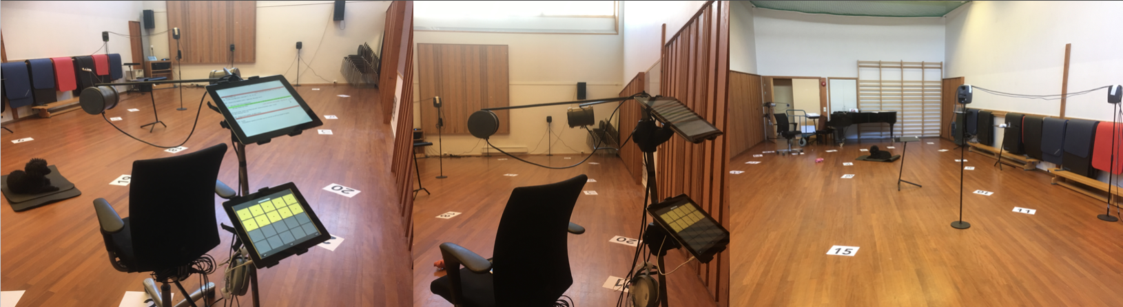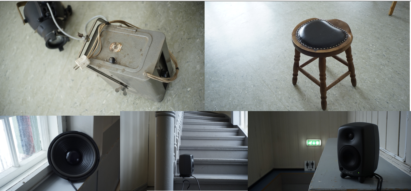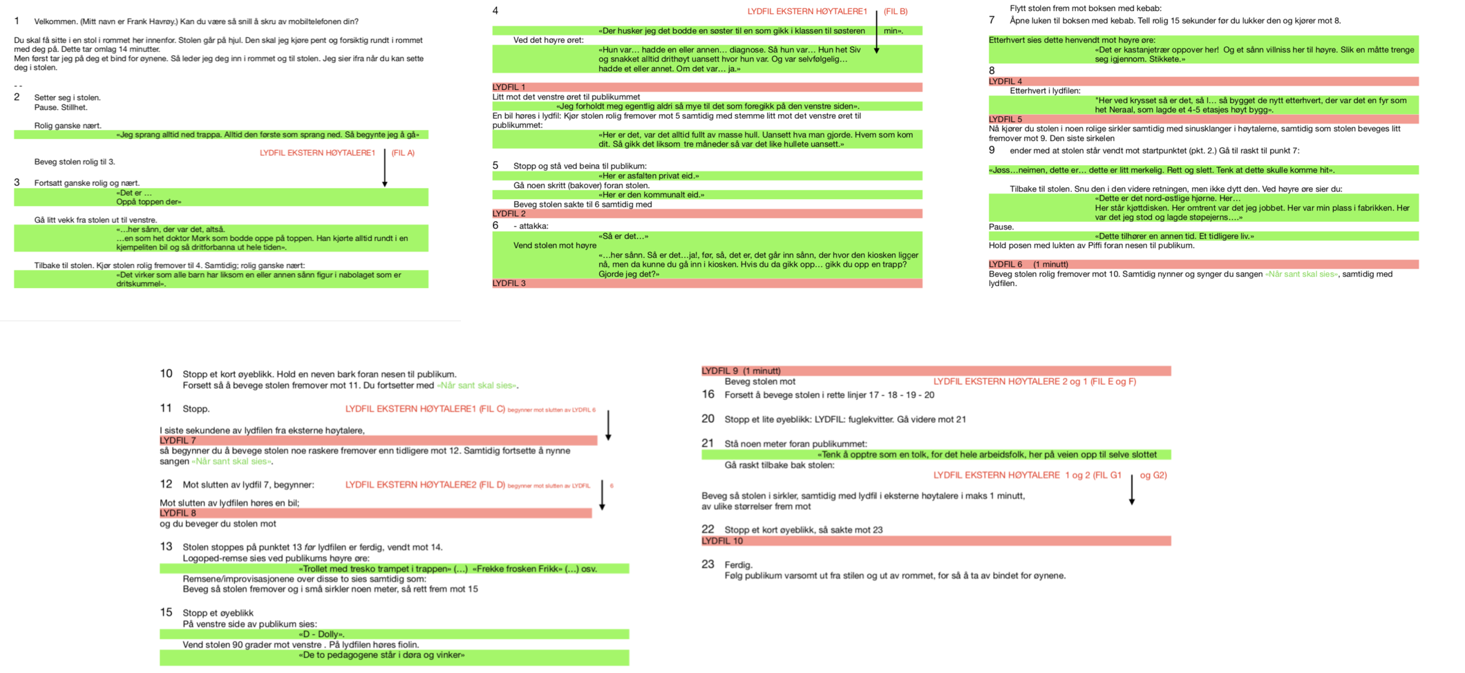 Det lydmaterialet jeg nå hadde, ble satt sammen med det øvrige materialet til en totalitet av lyd, narrative bruddstykker, lukter, bevegelser, med mer. Med noen enkle rekvisitter; fire høyttalere i rommet, samt den spesialkonstruerte stolen på hjul med nær-høyttalere rett ved publikummets ører, iscenesatte vi dette materialet på basis av et partitur eller manus. Et knippe inviterte publikummere deltok.