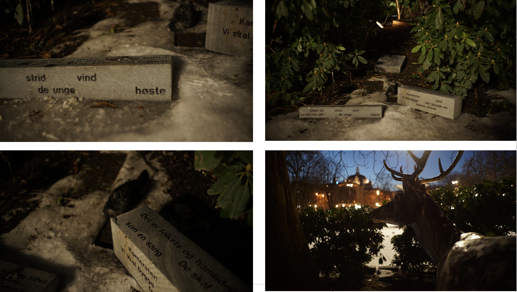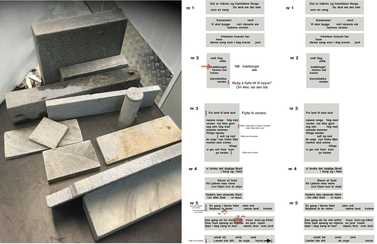 På samme tid som jeg arbeidet med disse fem arbeidersangene og reduksjonen av tekstene, kom jeg over noen steiner som lå i en søppelhaug i forbindelse med byggingen av Spikkestad kirke- og kultursenter. Det var litauiske og polske fremmedarbeidere som hugget til og la disse steinene i forbindelse med byggingen av kirken. Senere viste det seg at steinen antageligvis var importert fra Portugal eller Kina. Jeg tok en håndfull av disse tunge steinene med meg i bilen. Det var en ren innskytelse der og da, men i løpet av noen dager bestemte jeg meg for å trykke de reduserte tekstene fra arbeidersangene på disse steinene.