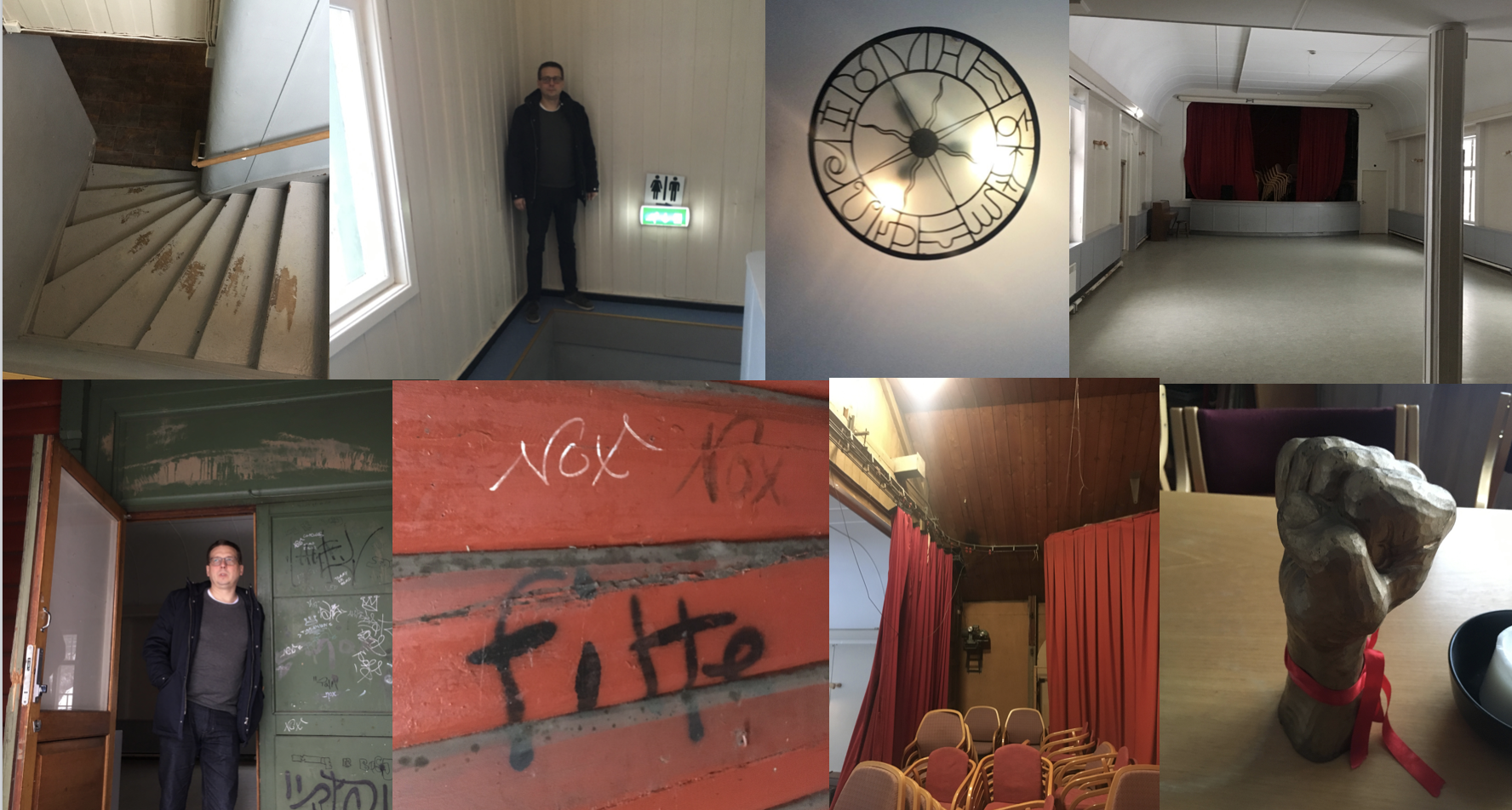 Jeg så innledningsvis faren for at dette potensielt sett selvsentrerte perspektivet ville gjenta seg, om enn i en annen form med helt andre kvaliteter, i samarbeidet med Frank. Denne personlige inngangen var jo tilstede i det innledende arbeidet, som et sted å starte. Men da Frank endte ved Folkets Hus, opplevde jeg dette som en frigjørende og samtidig kjærkommen mulighet til å sette individet tydeligere i forbindelse med noe kollektivt, noe utenfor en selv eller noe større som en var en del av. Det var så og si der allerede i Frank sin biografi. Jeg kjente også interesse for å jobbe med et konkret sted, kanskje nettopp i kontrast til «Her», hvor vi brakte det personlige og stedsspesifikke inn i en teatersal.