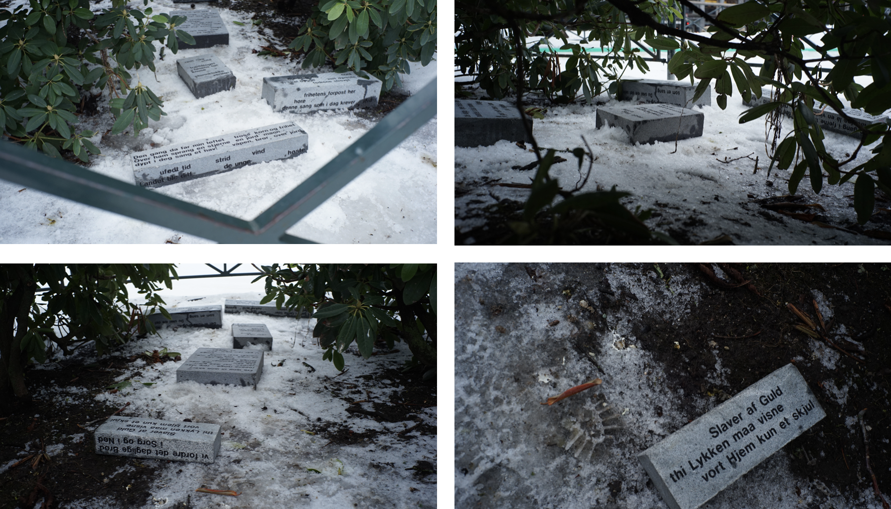 Tidligere hadde jeg vært i kontakt med Jølstad Gravstein i forbindelse med to dødsfall i familien og jeg dro til dem for å få gjort arbeidet med å sette tekstene i steinene. Gjennom å ta bort ytterligere tekst og justere tekstene sammen med Kim Nilsen og Jens Åge Kilen, kunne vi med 6 bar sandblåse teksten inn i fem steiner og sette svart farge.