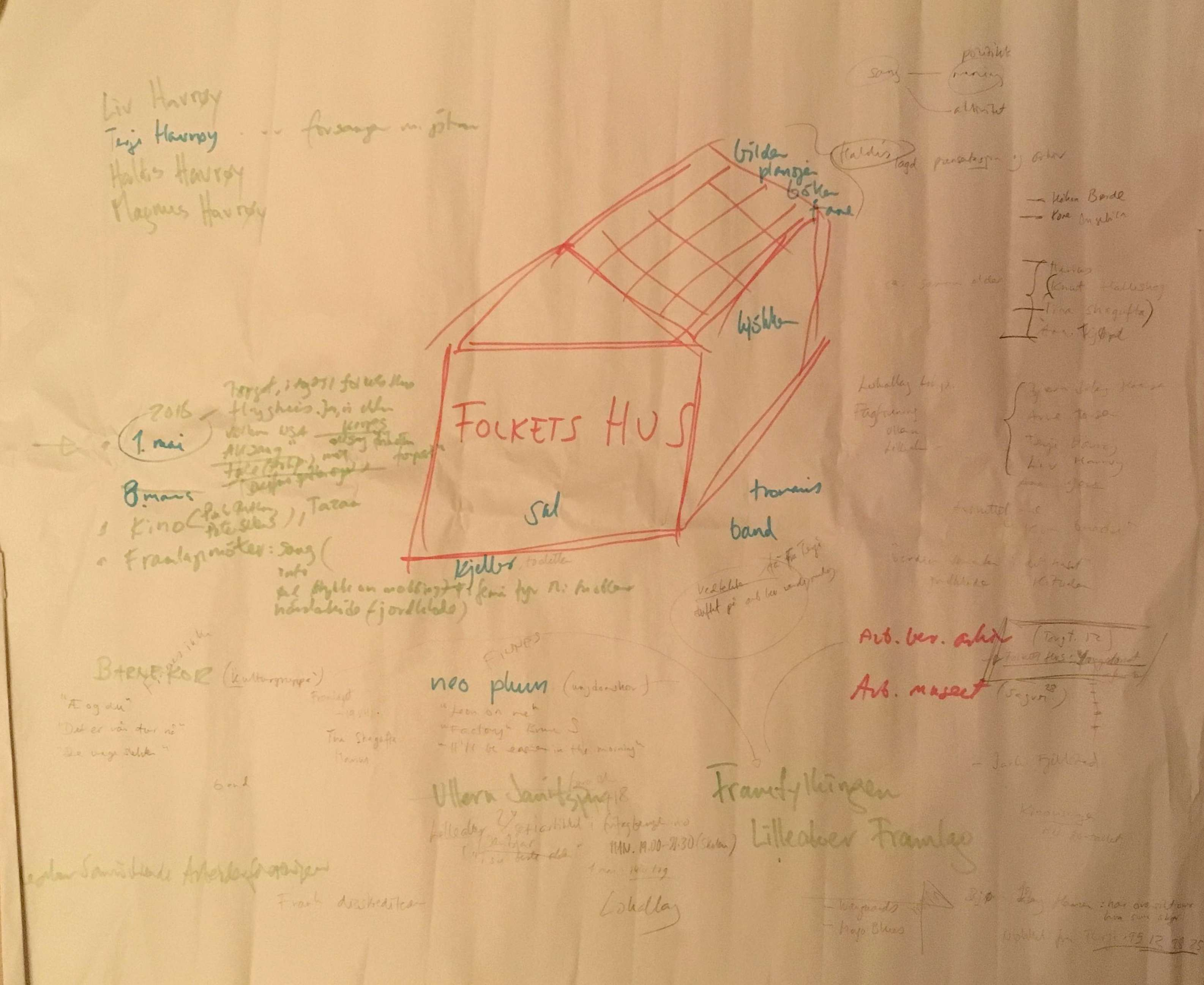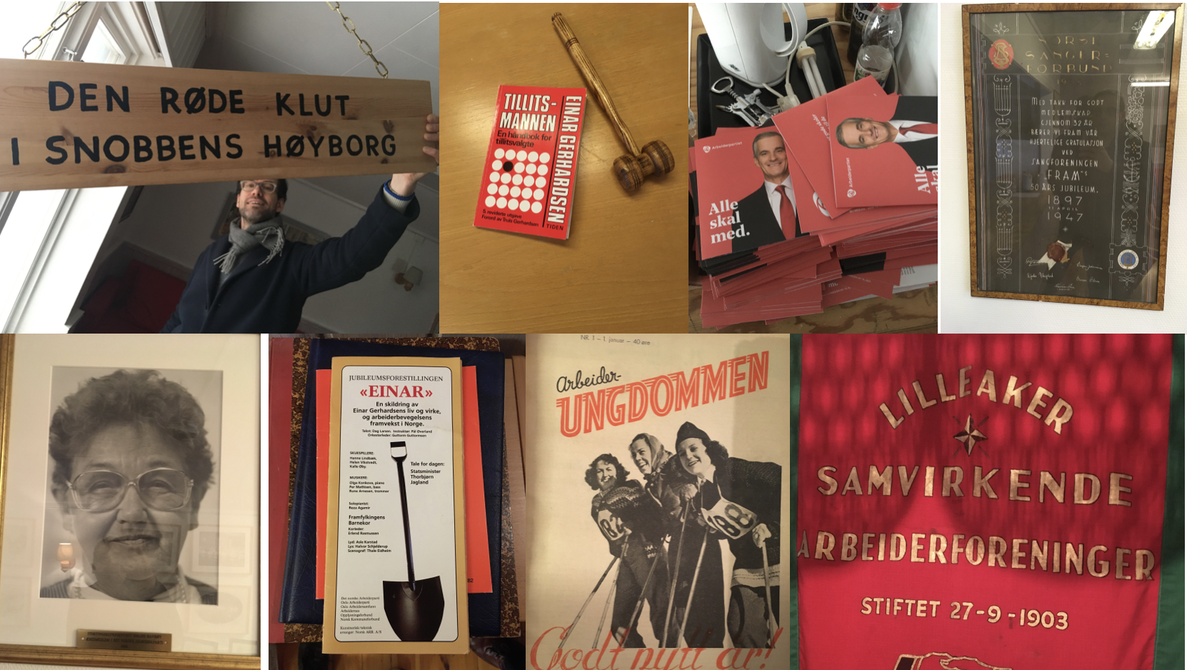 Det påfølgende arbeidet startet opp igjen i november 2018. Da besøkte Frank og jeg Arbeiderbevegelsens arkiv og biblioteket på Youngstorget i Oslo. Det meste av arkivet og etterlatenskapene fra Lilleaker Folkets Hus var plassert der, og det opplevdes som viktig å kikke på dette materialet. I flere timer bladde vi gjennom dokumenter av ymse slag. Kanskje ikke unikt som sådan, i driften av de fleste Folkets Hus akkumuleres dokumenter som viser sider av virksomheten. Men likevel, å kjenne på arkivets materialitet og bla seg gjennom dokumentene, gir en erfaring av mengden og det nitide arbeidet som har blitt lagt ned i driften av huset. Det være seg medlemsregistre, oversikter over hva som ble solgt av drikkevarer ved ulike anledninger, vederlag for å vise film, klager på at aldersgrensen brytes ved de samme filmvisningene, oversikter over billettinntekter, brev om ansettelser, brev om oppsigelser, rekvirering av bygningsmasse til militært formål, lånedokumenter, gjeldspapirer, infoskriv om brannbomber, korrespondanse med sentralledelsen i partiet, korrespondanse med lokallagene, bygningstegninger, kontrakter, rapporter, formålsparagrafer, lover, reglementer, annonseringer av 1.mai-feiringer, regler for bruk av bygget, lapper og notater. I tillegg en rekke manus, underholdningsforslag, pamfletter, taler og sanger.