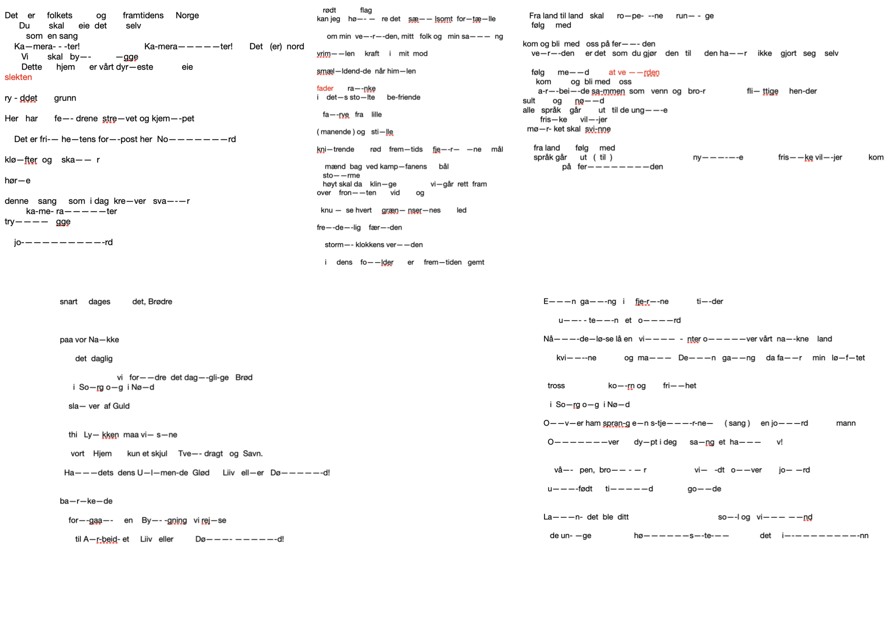 I korte trekk eksperimenterte jeg med å legge fem arbeidersanger oppå hverandre i tid, og prøve meg frem med en form for tekstlig og lydlig gjennomslag. Ved å la tekstbrokker fra hver av de fem sangene tidvis slå igjennom – litt slik jeg husker fra jeg var barn skjedde på det siste eksemplaret i en bunke ark i en blåkopi – ønsket jeg å lage en mosaikk basert på disse fem sangene. Dette lappeteppet eller syntesen, alt ettersom hvordan en oppfatter det, ville fremkomme som en ny tekst, en ny sang. Gjennom dette arbeidet kom jeg tettere på den klangkroppen som arbeiderbevegelsenes musikk utgjør. Samtidig fikk jeg kjenne på kroppen og med stemmen de ord som brukes, og ikke minst den metaforikk som over tid er utviklet i bevegelsen og som manifesterer seg i sangene. Ved å sette ned tempoet og dra materialet ut i tid, ønsket jeg å undersøke ordene klanglig. Samtidig ville langsomheten motsi iveren i marsjtempoet og heller skape en opplevelse av sørgemarsj. Undringen min gikk dermed mot hvordan denne musikken kunne fungere som en mer ambient atmosfære og hvordan dette materialet kunne resonnere i omgivelsene.