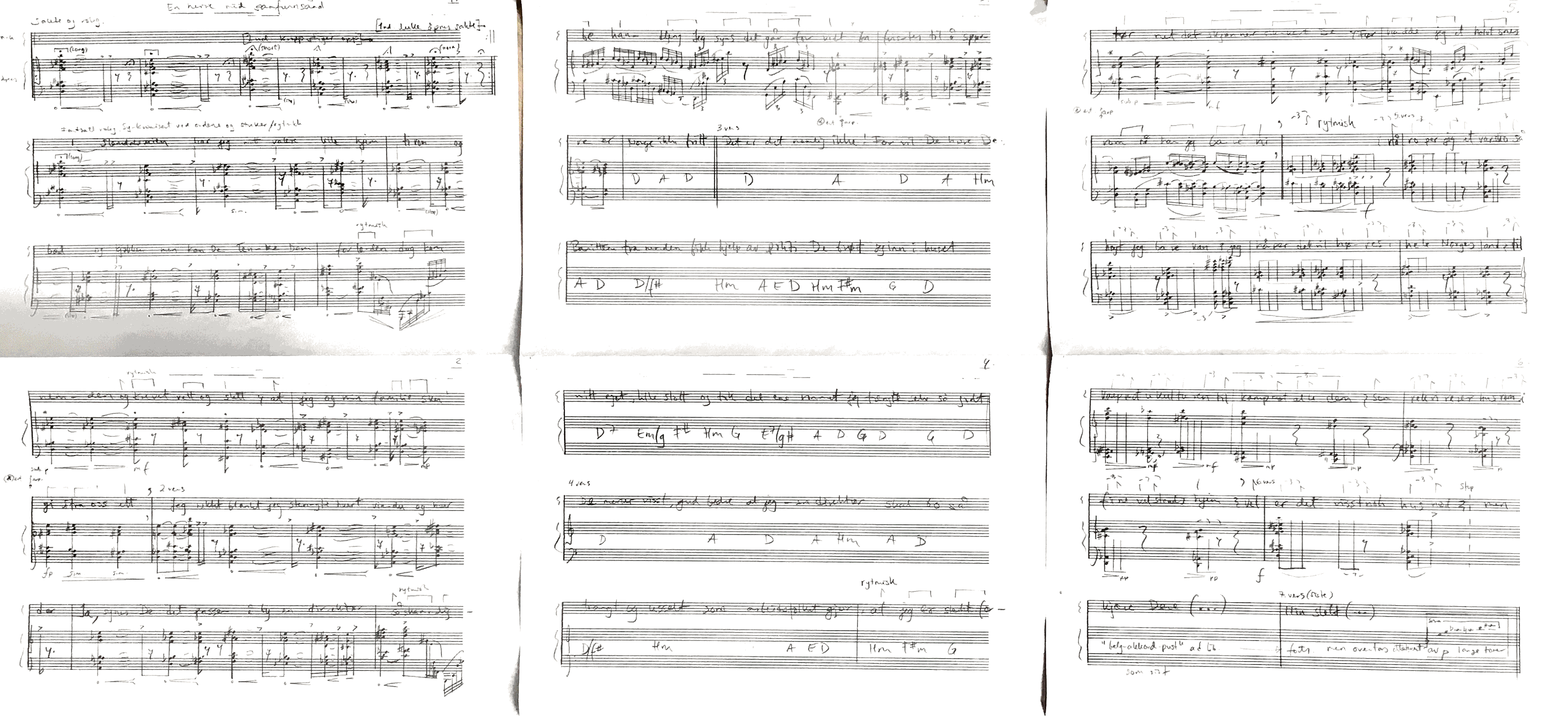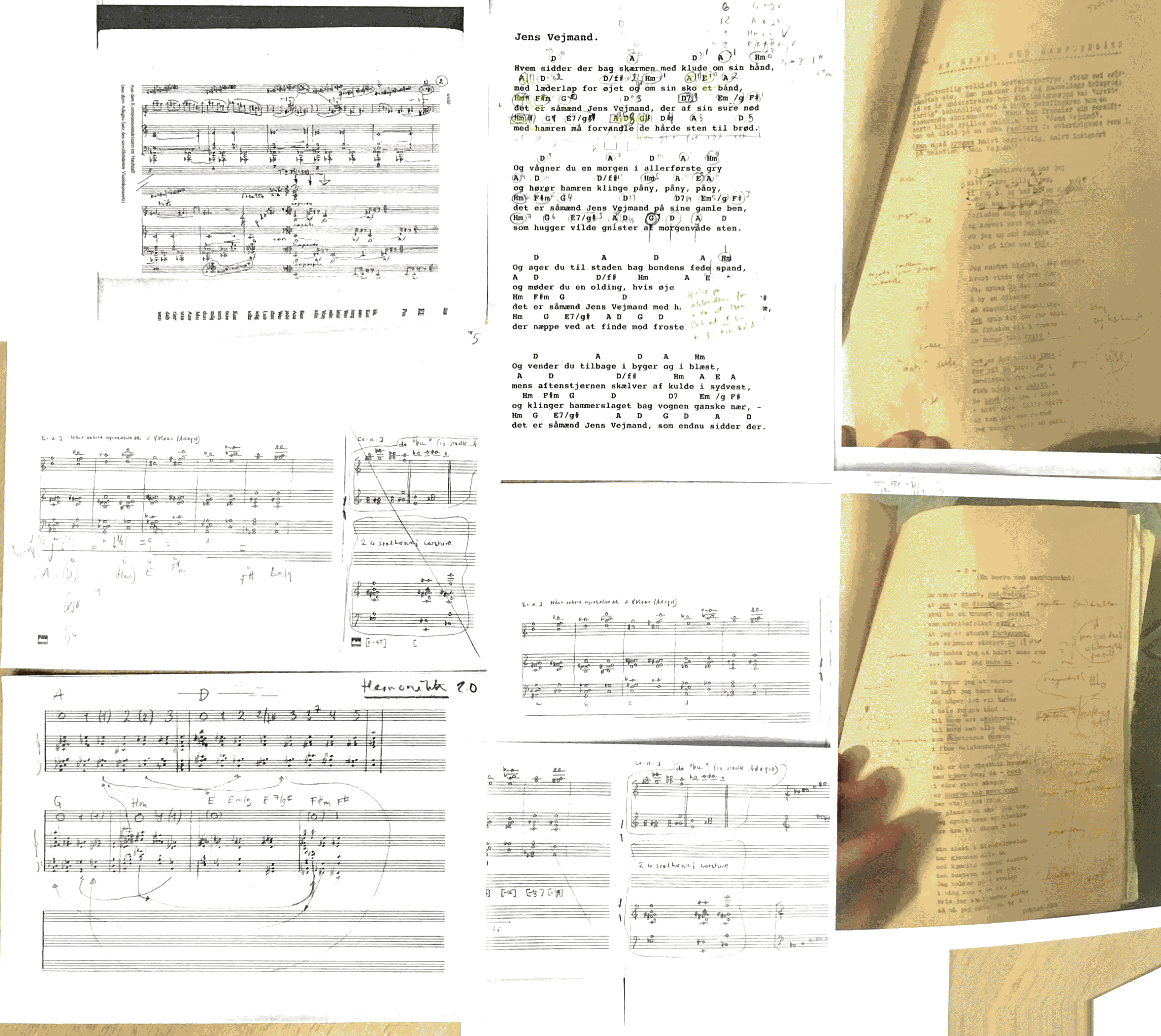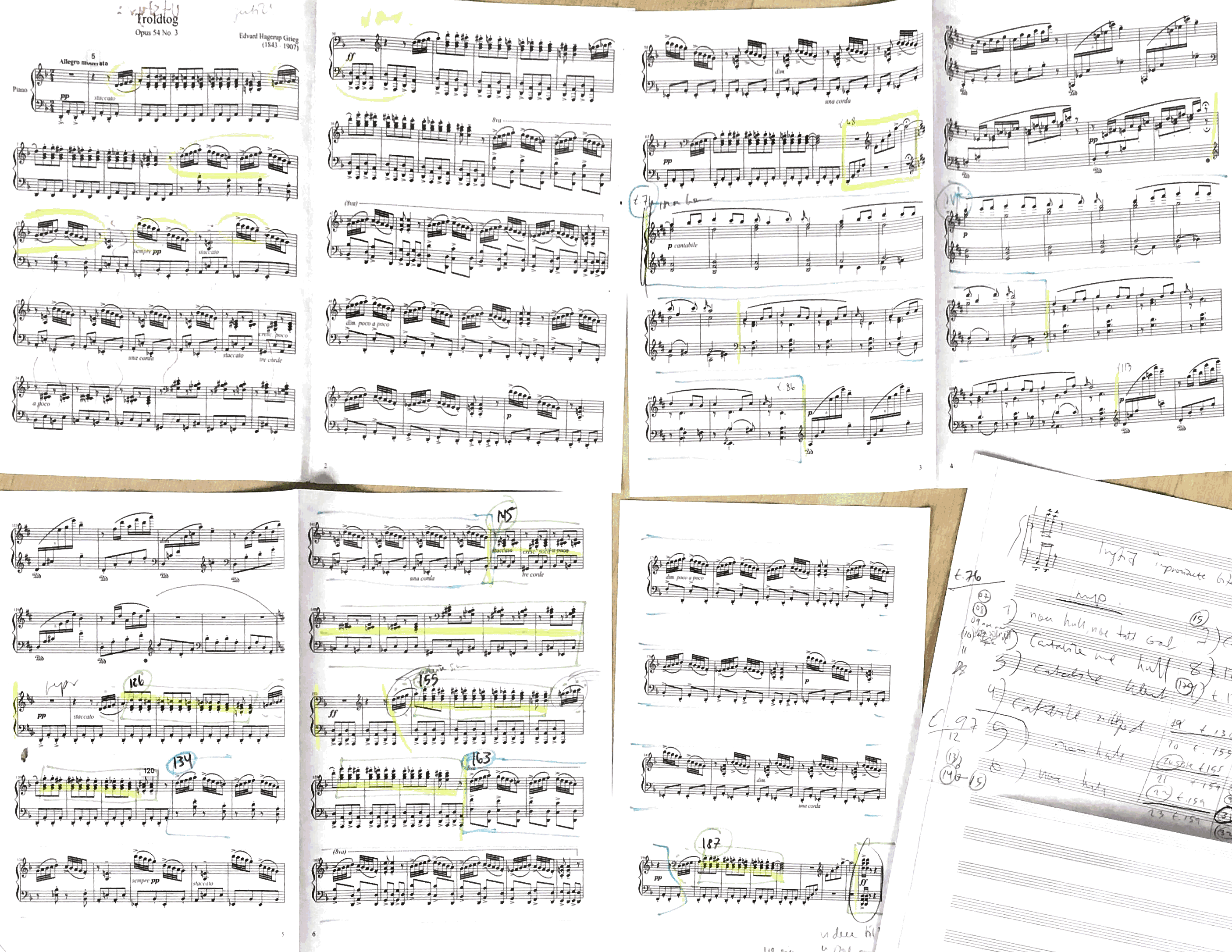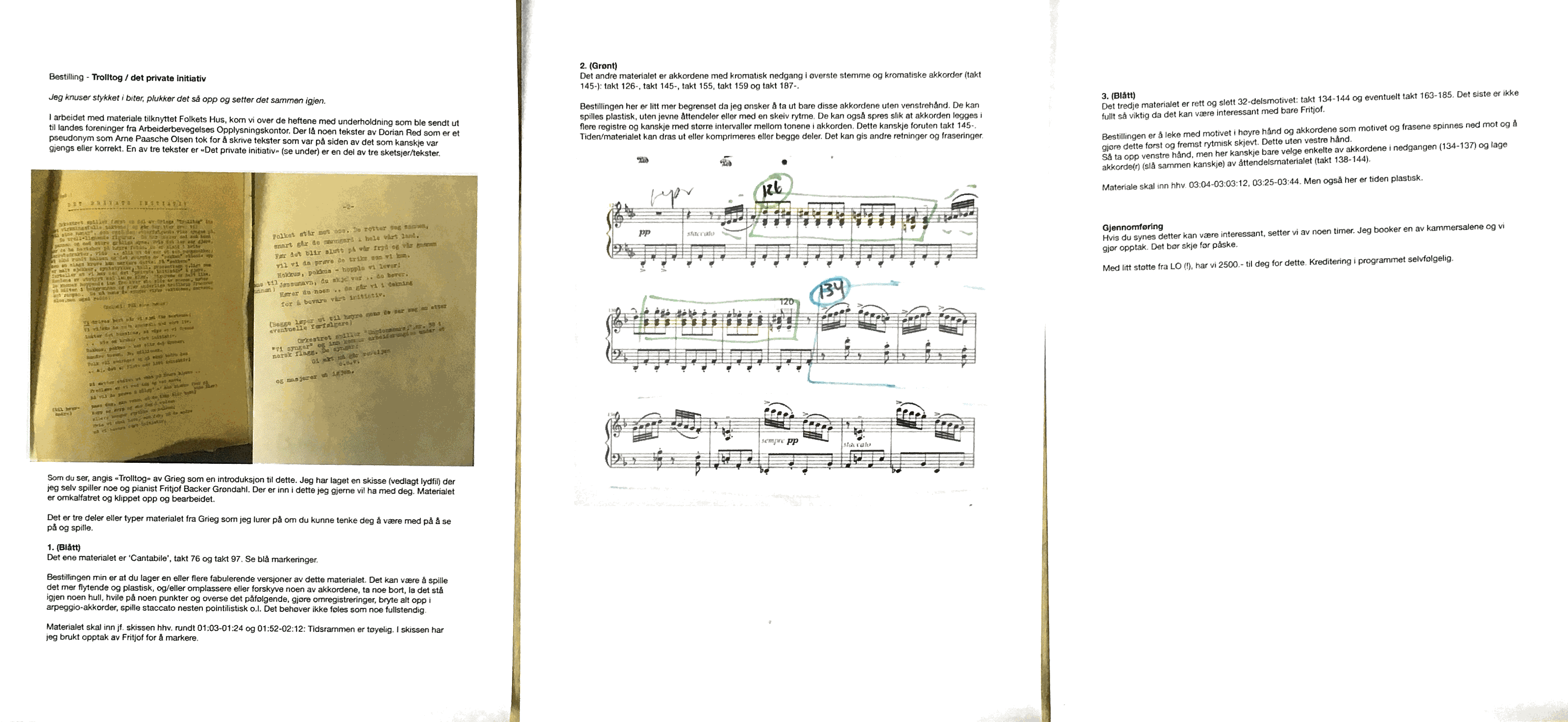 Musikalsk tok jeg tak i den musikken Arne Paasche Aasen, noe plumpt kanskje, hadde foreslått. «Orkesteret spiller første del av Griegs ’Trolltog’ (de mest virkningsfulle taktene) og går deretter over til ’Pål sine høner’, som også den etterfølgende vise synges på.» Jeg ønsket å utforske hva det «virkningsfulle» kunne innebære, men også hvordan materialet fra Grieg kunne undersøkes i samarbeid med pianist Ingfrid Breie Nyhus. Ved å sende henne en innledende oppgave og forespørsel, som dannet grunnlaget for en utforskende improvisasjon og innspilling av de musikalske byggesteinene i Grieg sin musikk, kunne jeg utforske disse transformerte elementene i det videre komposisjonsarbeidet.