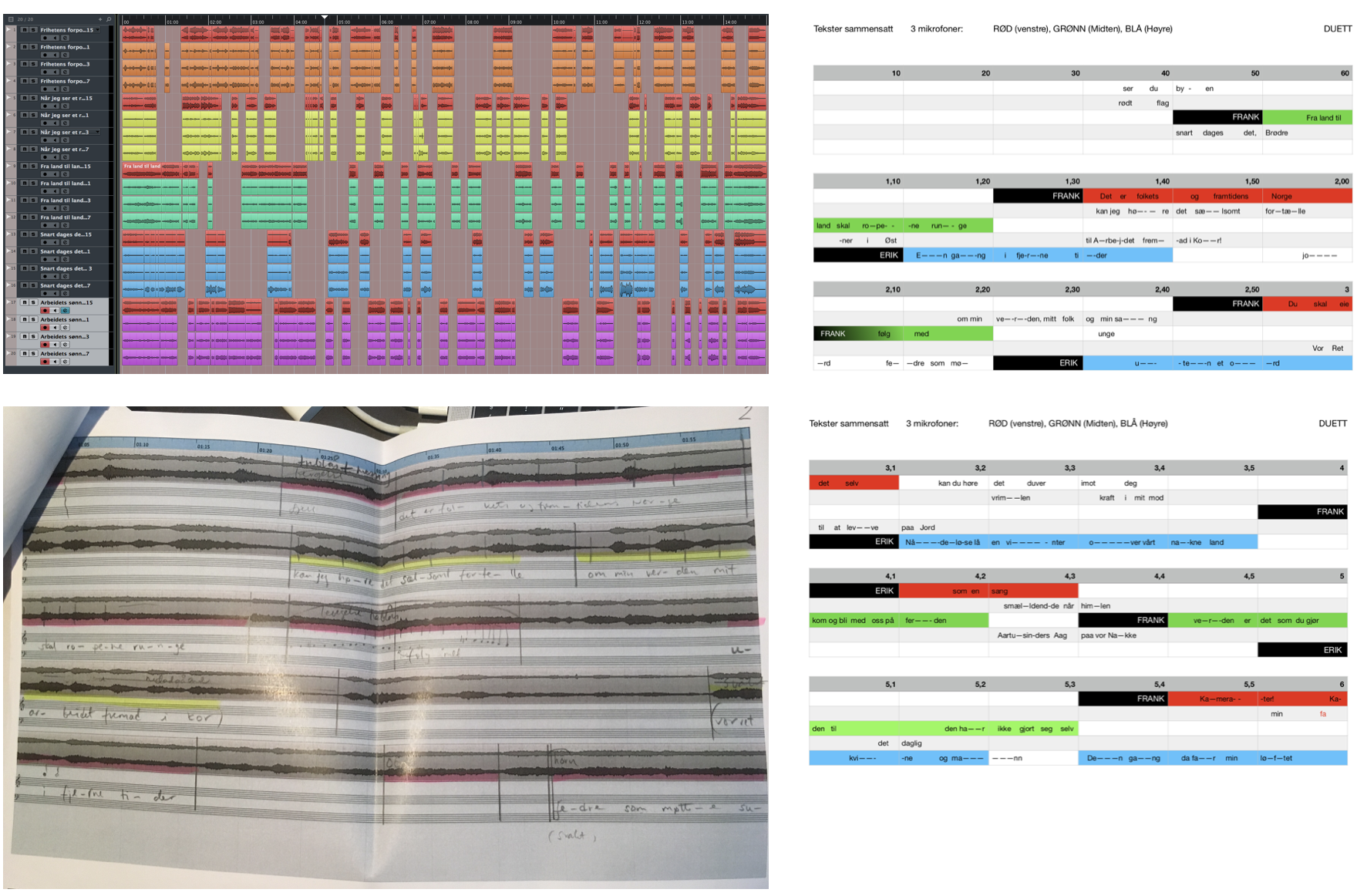 Det er jo på sett og vis en kjensgjerning at det håndfaste ordet og det konkrete uttrykket i arbeiderteateret så vel som i arbeidersangene, stod i kontrast til deler av det arbeidet vi gjorde. Eller sagt på en annen måte, denne tosidigheten, som jeg forøvrig opplevde er sterkt tilstede i Frank sin bakgrunn og praksis som sanger og skuespiller, skapte et kreativt felt for meg å arbeide i og med. Underveis i prosessen kom personer med tilknytning til huset innom. De var nysgjerrige på hva vi drev med og hva vi lagde, og hvilke sanger vi kom til å synge.