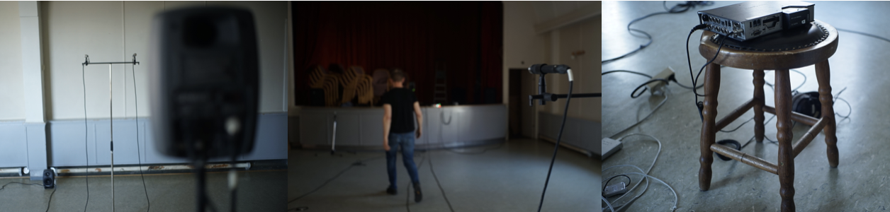 Med utgangspunkt i dette så jeg muligheten for å iscenesette materialet i et rom sammen med Frank. Først og fremst som et eksperiment. Utforskningen handlet på mange måter om å forflytte denne turen og disse stedene til et konsertlokale, fortette de geografiske punktene og ta vekk store deler av transportetappene mellom punktene. Jeg ønsket å utforske hvordan et intimt format ville fungere, og foreslo derfor at vi skulle gjøre dette for én og én publikummer av gangen. Siden det visuelle og topografiske, det stedspesifikke, var fjernet til fordel for et konsertlokale – vi skulle altså ikke gå den konkrete turen fra Haråsveien til Lilleaker Folkets Hus – ønsket vi å dekke til øynene til hver publikummer. Gjennom de gjenstående sansene skulle denne utforskningen utarte seg.