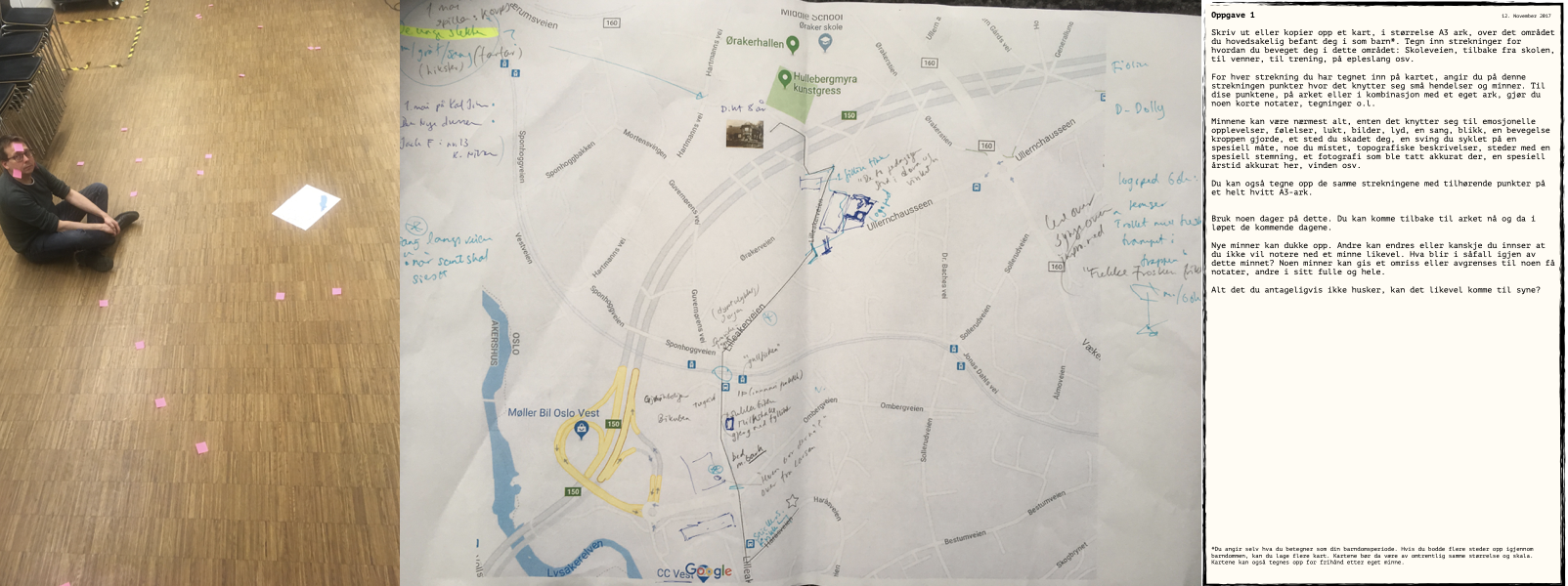 Frank gjorde dette, og i enden av rommet og turen kom han til Folkets Hus på Lilleaker. Utifra dette kartla vi turen i detalj og markerte de stedene han stoppet opp og re-visiterte. Videre arbeidet vi med hvert av disse konkrete stedene for å utvide minnene om dem, enten det var sanselige minner eller narrative bruddstykker som best lot seg gjengi med ord.