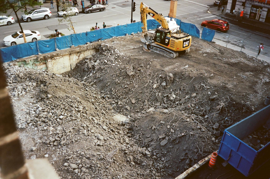 Today I moved to downtown for a little more than a week, because my house is falling apart - the underground must be rebuilt. You saw the cracks in my house (look at the picture I've just put). The workers are going to fix the basement to make the building not fallible; they're going to work against the infra world that is trying to connect with the ground of Montreal. I'm also leaking: I was so anxious that I cut my nails again, too much. I am bleeding again. And my new temporary apartment is almost falling apart as well: they're blasting the building in front of mine with dynamite, the street is closed in the direction towards Rue Ste. Catherine so to go to Kazu (which is 60 meters from here) I have to go around the block. Today they performed some blasts, and I felt that my whole building trembled. On the other side of the street, they're also demolishing! I forgot how this is still possible in Montreal, well, at least only in Downtown. It's so funny because some years ago I did a course of creative writing with a lovely Brazilian writer and he said that the possible genre in places like São Paulo or Shanghai is the chronicle. The buildings appear and disappear so fast there that entire pieces of old brothels, bars and small structures simply get out of the realm of existence (at least on the way they used to be) in a few days, and only a chronicle would be able to narrate so quickly the daily life stories of those places. Well, I said it was funny, but I didn't tell why. Here in Montreal, I feel like we're ALWAYS under construction. But also that things stay as they always were. Maybe they're not efficient on construction business here, and who needs efficiency, anyways? But yes, I forgot that downtown has other agreements and laws that allow the construction of big buildings.
