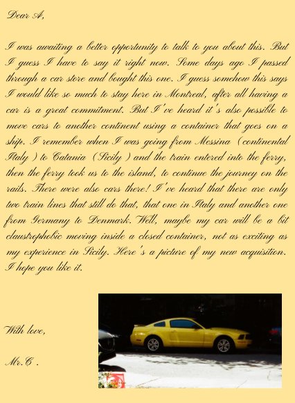 Just before I left for Montréal, I wrote my best friend and parents a letter. I didn’t know if I could even come to Canada; I was close to giving up on all my plans. I felt nothing; I didn’t know anything, I was continually collapsing and on all levels. But I figured; if I have nothing else than wanting to die, I can just as well do it there. If death in Amsterdam is the only outcome, Montréal could be the fabulation of a world worth living. I wrote that I was sorry that every day they would find a daughter and a friend at their door that could only tell them she had to be with them to make sure not to kill herself. I remember writing the letters so. I couldn’t stop crying, and I couldn’t read my own messages, most of the ink even vanished from the tears, it was so dramatic.