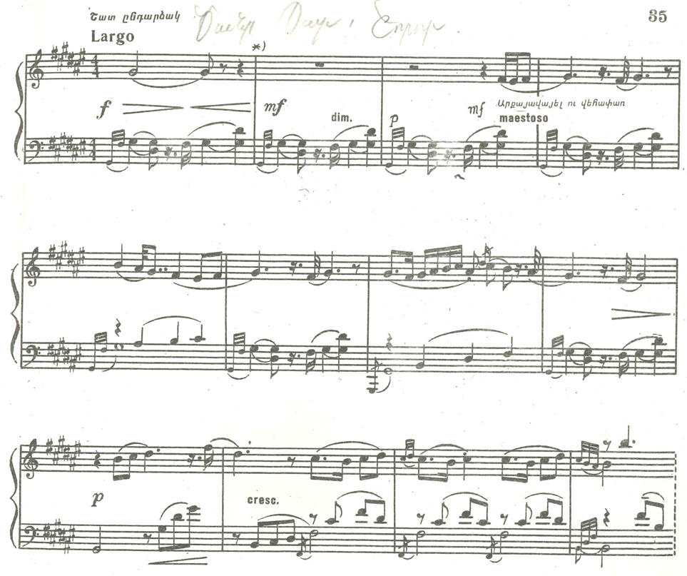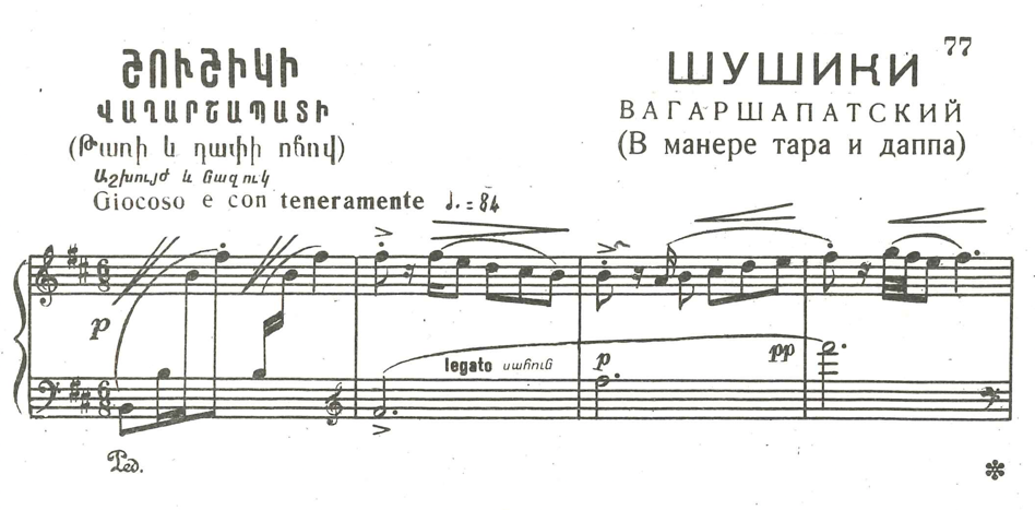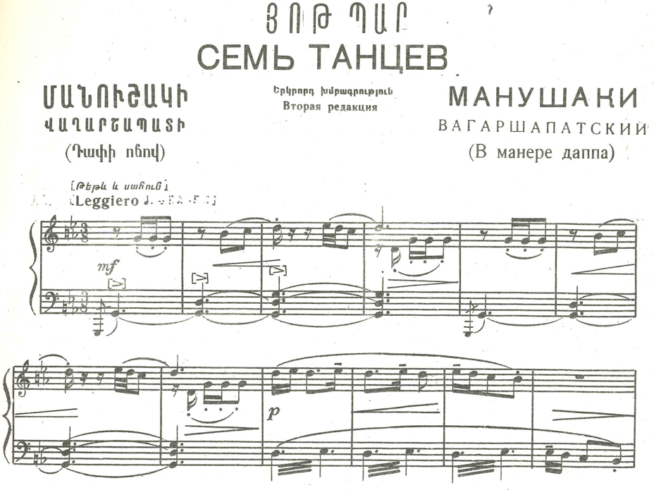 The first edition gives us the “Dances” as they were until the summer of 1909 when, after the first performances, the composer made needed edits that he noticed and was pleased from the result. MshoShoror is presented here in the version of 1906. The second edition gives us the MshoShoror and the Dances in the version as they were in the summer of 1916 when, according to A. Harents, “Vardapet gave to the piano dances cycle it’s final version” (this “final version” expression most likely comes from the author) and was pleased with the result (Atayan, 1982, p. 15, my translation from Armenian).
