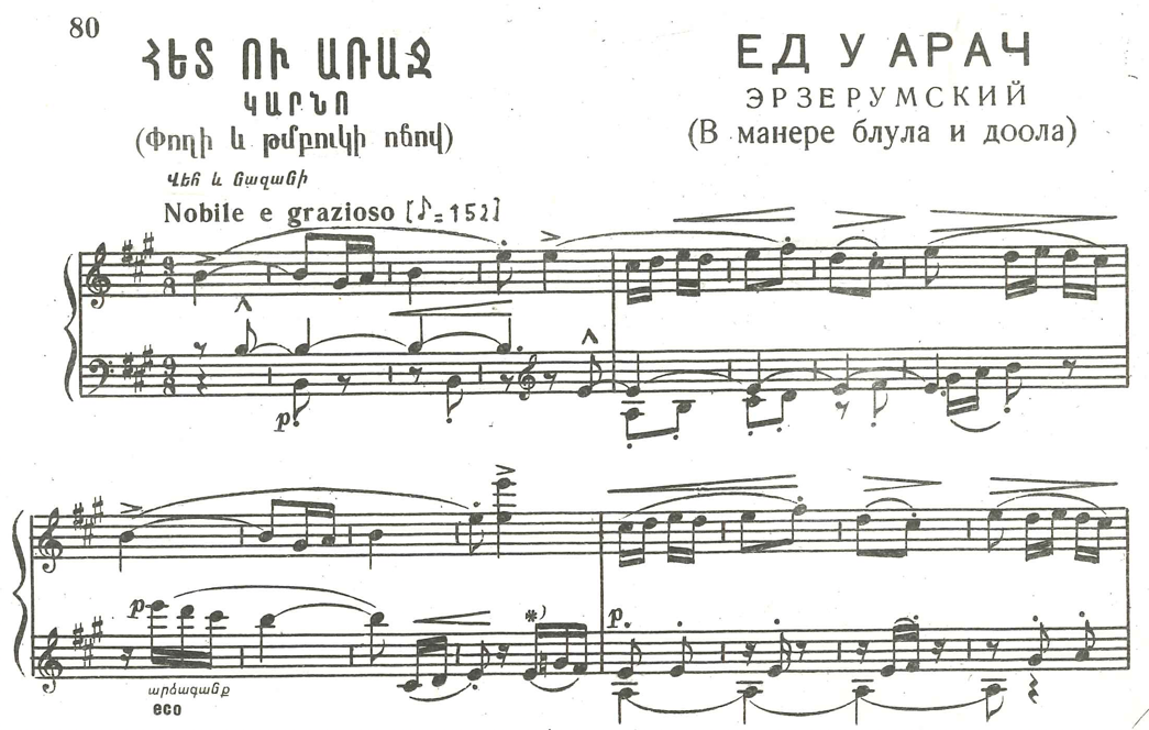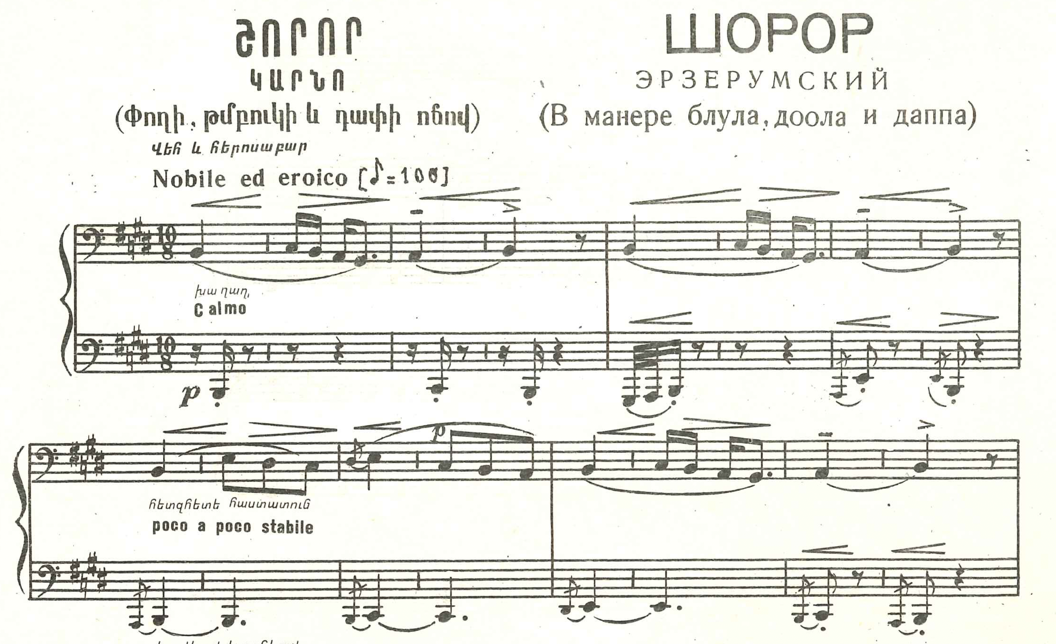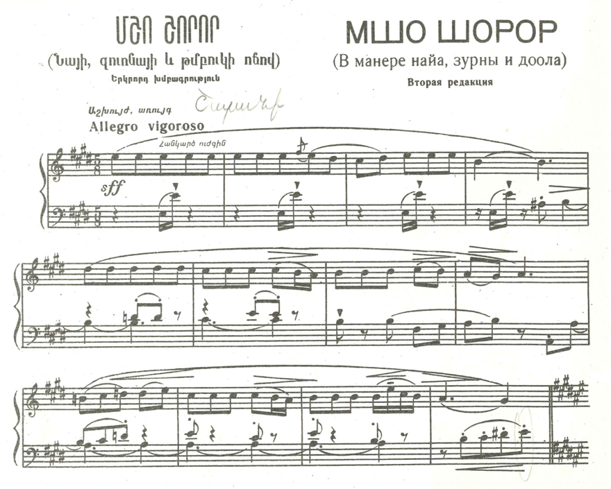 Komitas wrote this monumental folk dance for piano to be performed in the style of duduk, zurna, and tmbuk. This marking applies to the whole piece, and he does not provide any further comments about exactly which patterns, melodic lines, or sections are to imitate the sound of the particular instrument, or the sound of the combination of them. This opens up more possibilities to me as a performer to imagine my perception of the imitation of folk instrument sound when playing. I also write in the Armenian names of different parts of Msho Shoror here, in accordance with Atayan’s research based on Komitas’ manuscripts and other archive materials presented in the scores of volume six.
