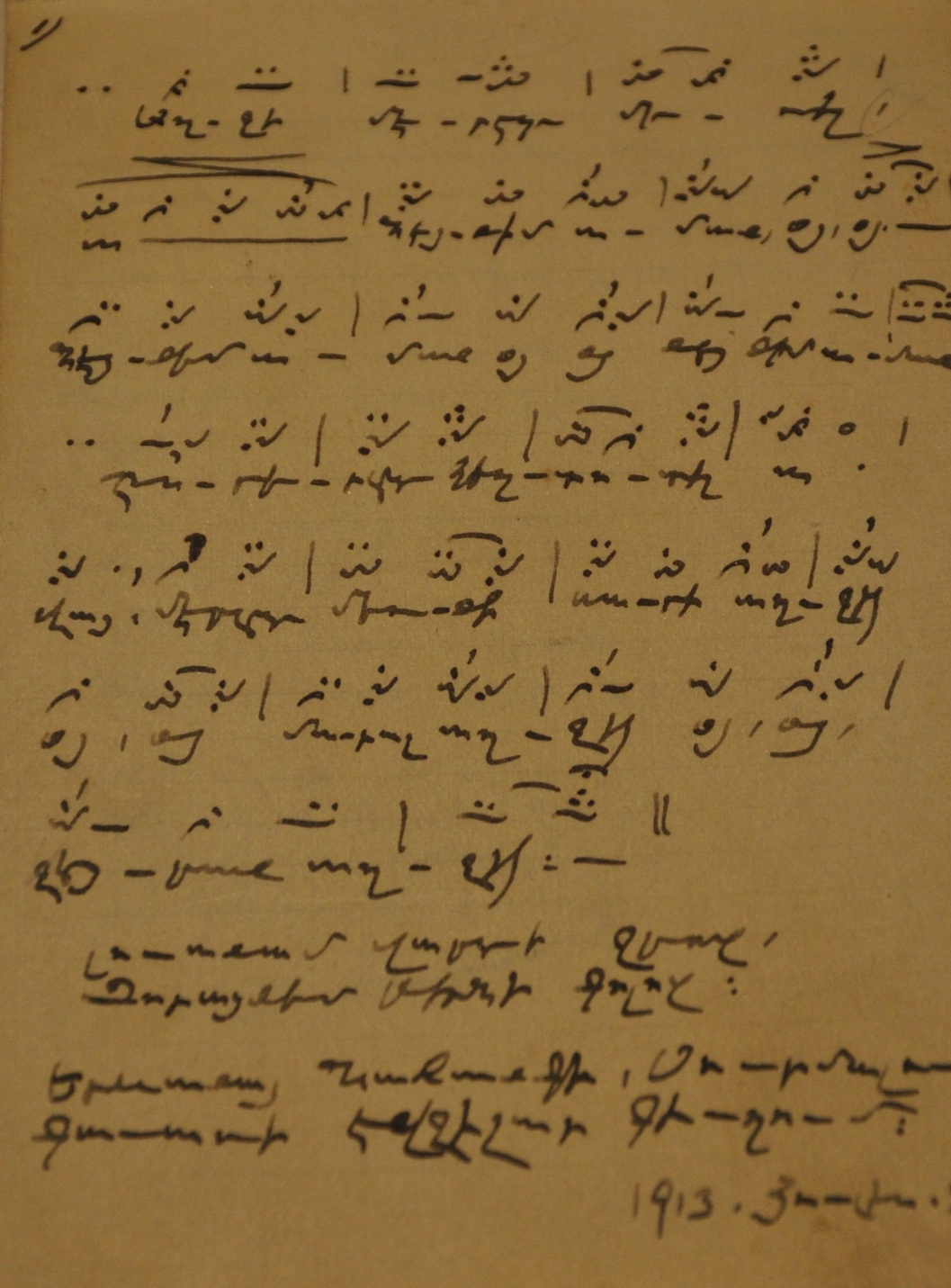 Komitas’ handwriting of a folk song, Sari Aghjik, with Armenian Musical Notation and Armenian lyrics, written in Yerevan province, Surmalu, Evjilar village, signed 1913, July.