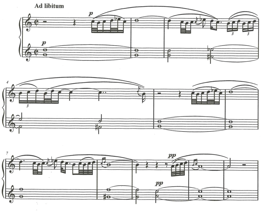 In Ounabi, the composer is more generous with pedal markings, especially with regard to some long pedalling on the first phrases, which I follow and use to create the effect of cloudy and voluminous musical layers. As in Manushaki, in Ounabi and Marali the left hand entirely imitates the dap, and the bass notes are often kept with slurs over the four bars and it is possible to maintain those basses with fingers, without using middle pedal, and yet still achieve the effect of the dam with a more transparent texture of sound which is more organic, with the ornaments and the melody in the right hand.